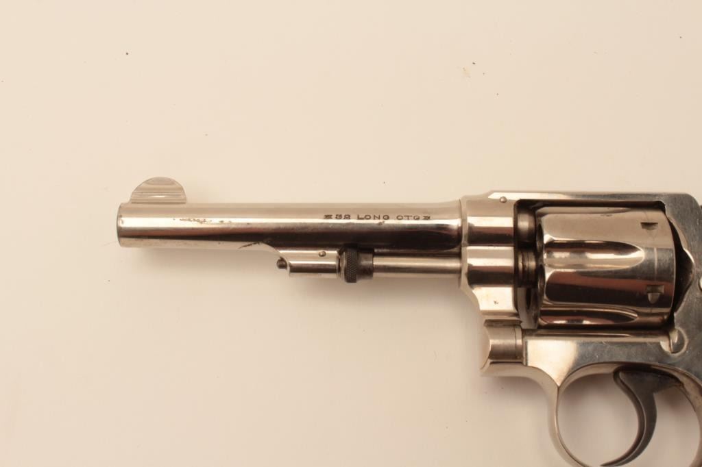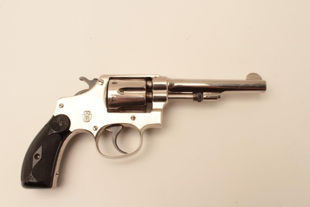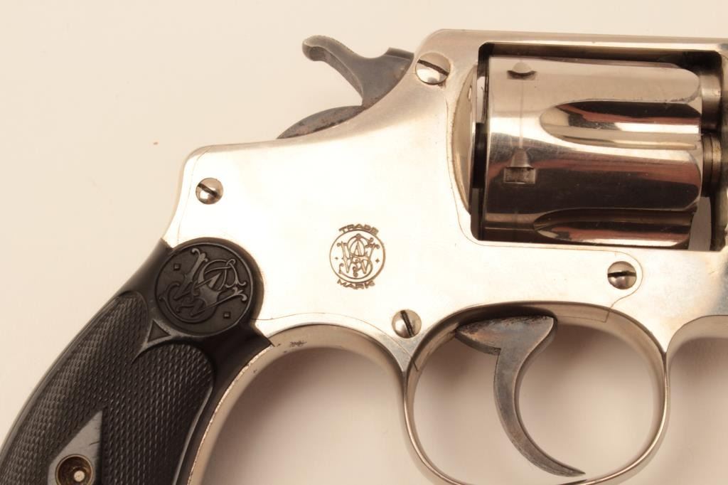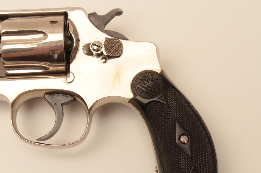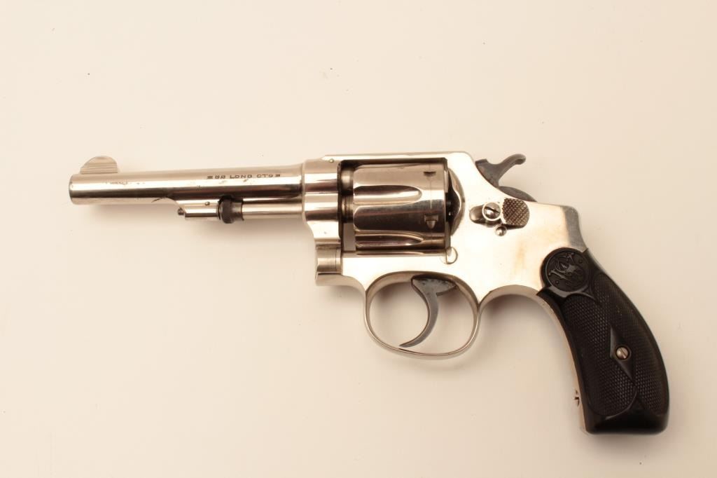 Smith & Wesson Hand Ejector DA revolver, .32 Long caliber, 4.25” barrel, nickel finish, checkered hard rubber grips, S/N 15985; fine condition overall with majority of original finish, fine bore, action, markings andgrips. (C&R). Est.: $300-$600.