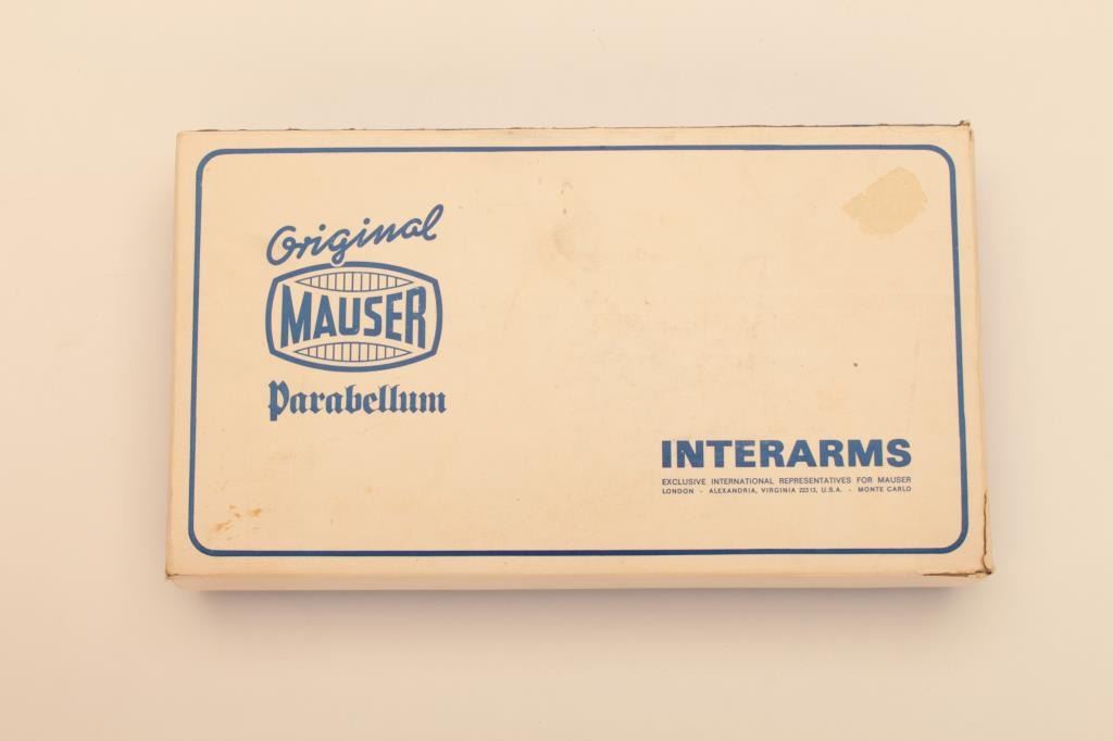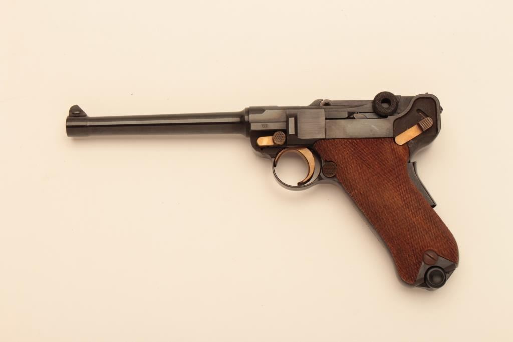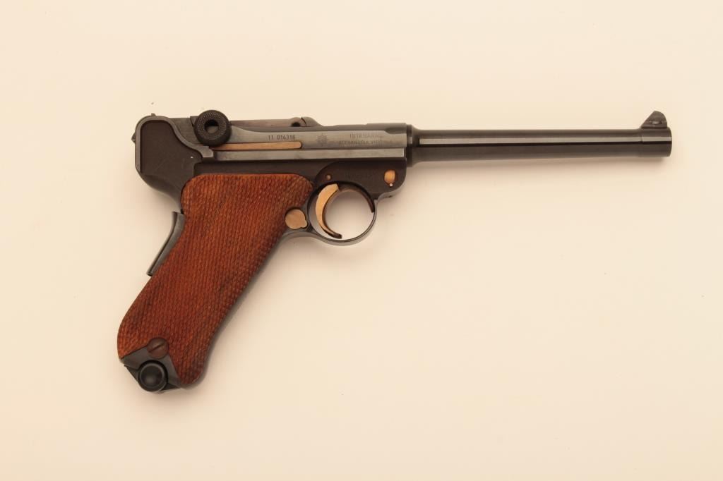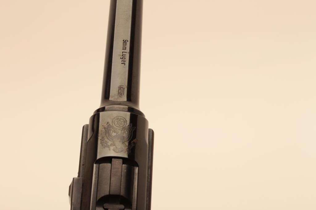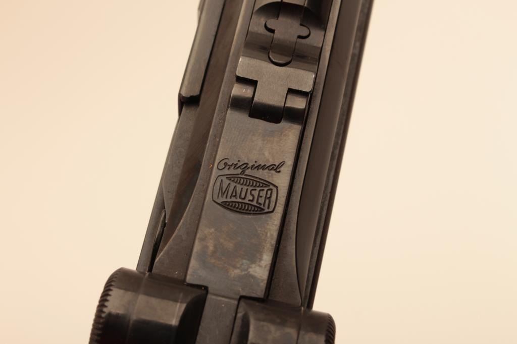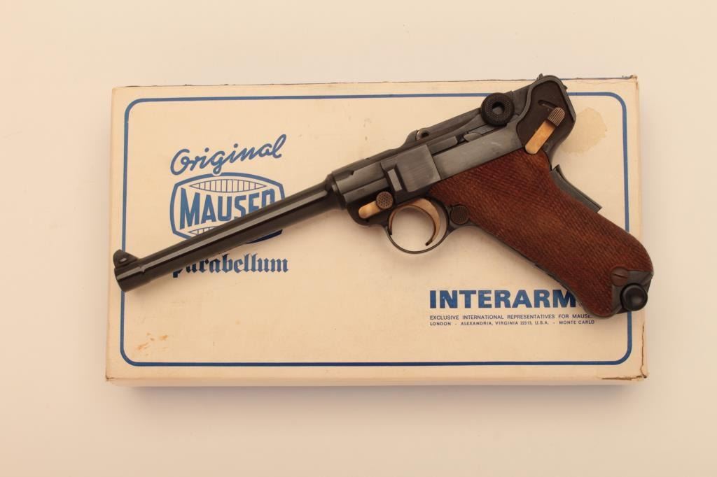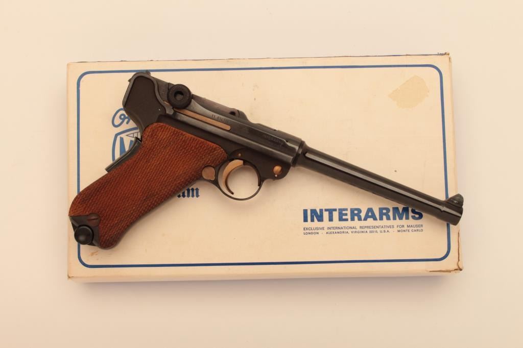 Mauser Obendorf Luger with American eagle and 6” barrel, S/N 11.014316. In excellent to near mint original condition. Slight storage only and no evidence of use. Includes 2 mags, takedown tool, rod papers and target. 99.9%plus. (Modern/PPT) Est.: $800-$1600