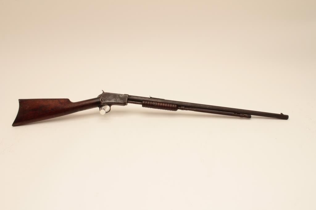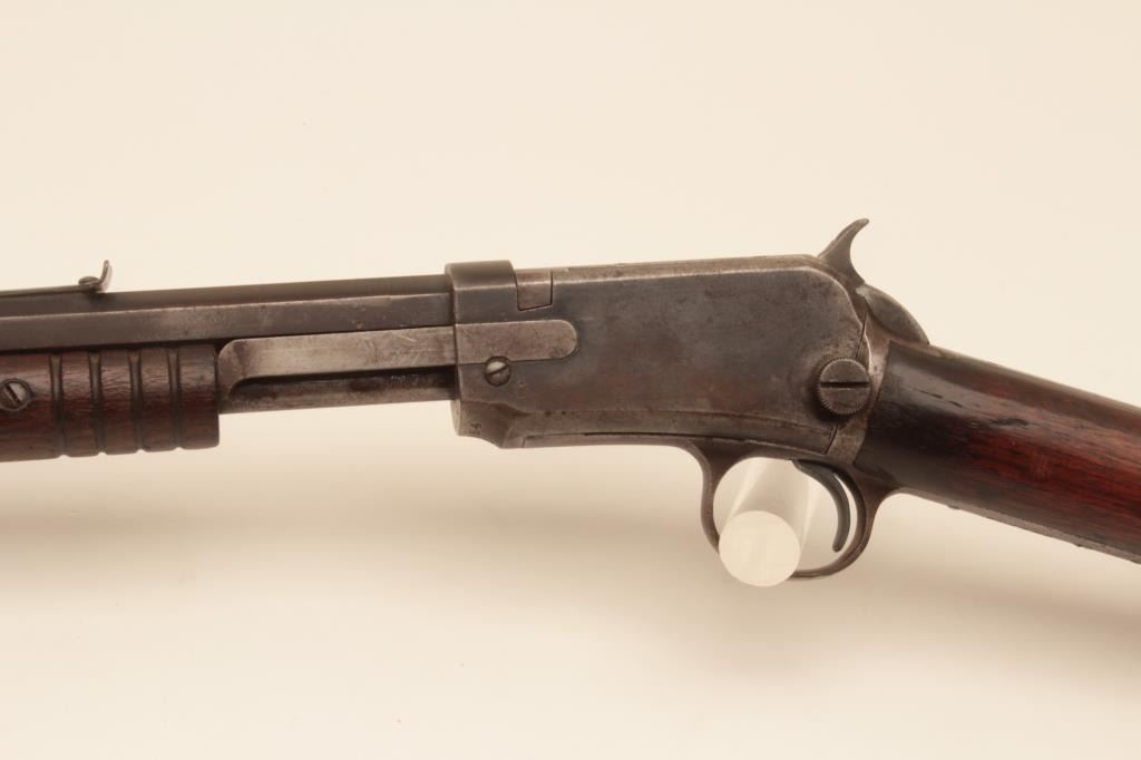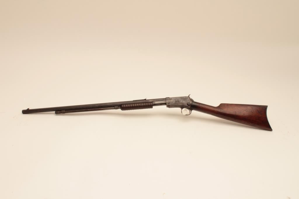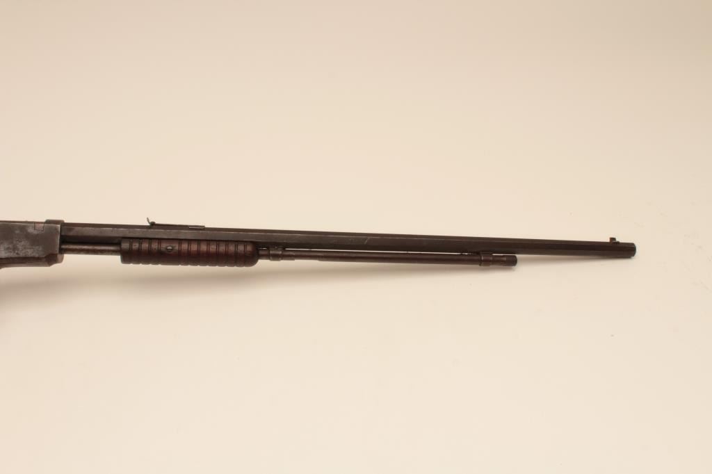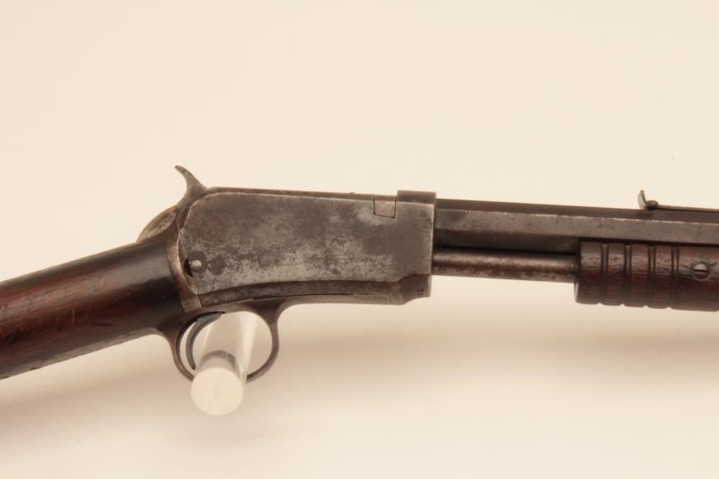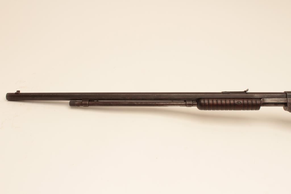 Winchester 1890 pump action rifle, #364554, .22 short, 24" barrel, smooth walnut stock. Rifle is in good condition overall, retaining approximately 50% original finish, stock is good, action is good. (C&R) Est. $250-500