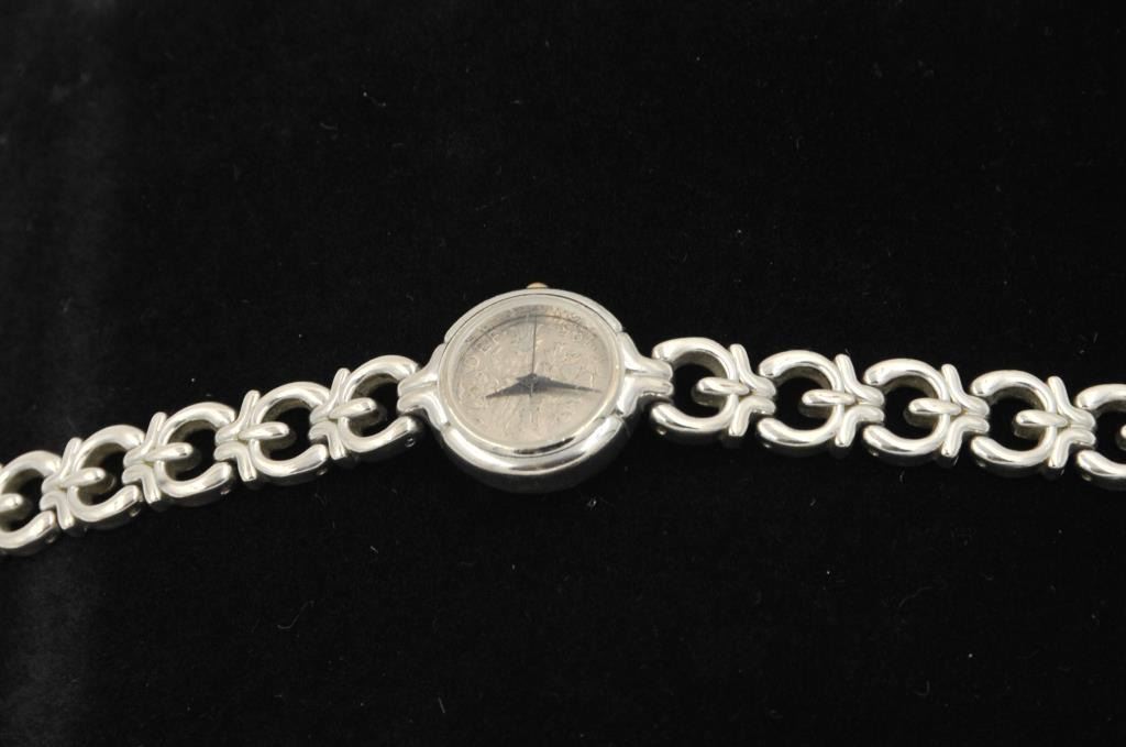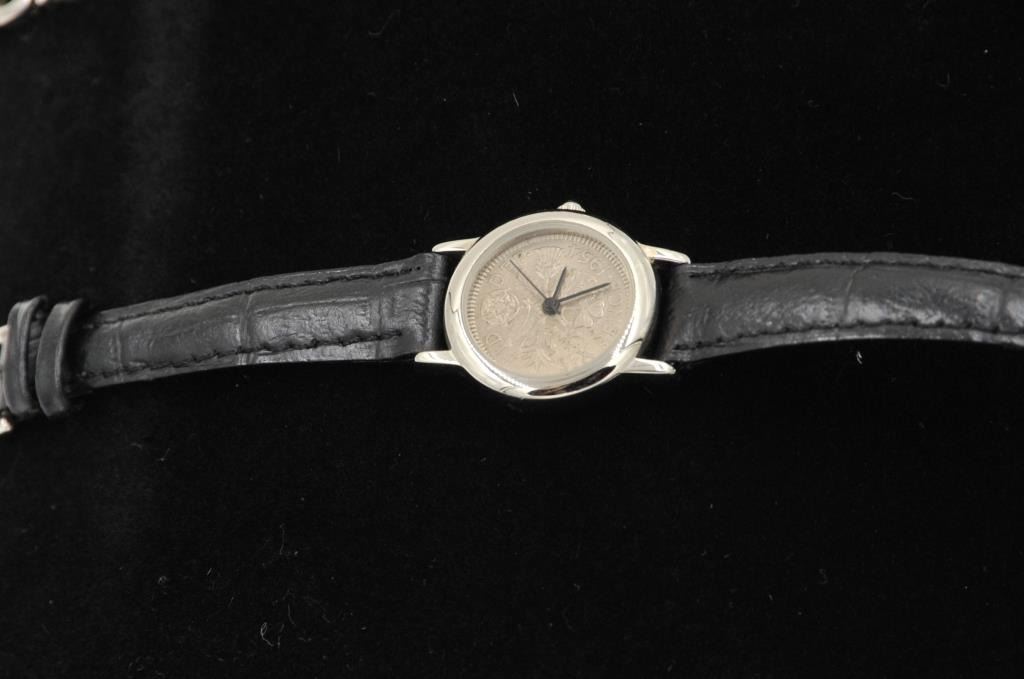Two ladies watches with collectors six pence coins used as dials designed by Peer Hardy. In working condition. Est:$100-200