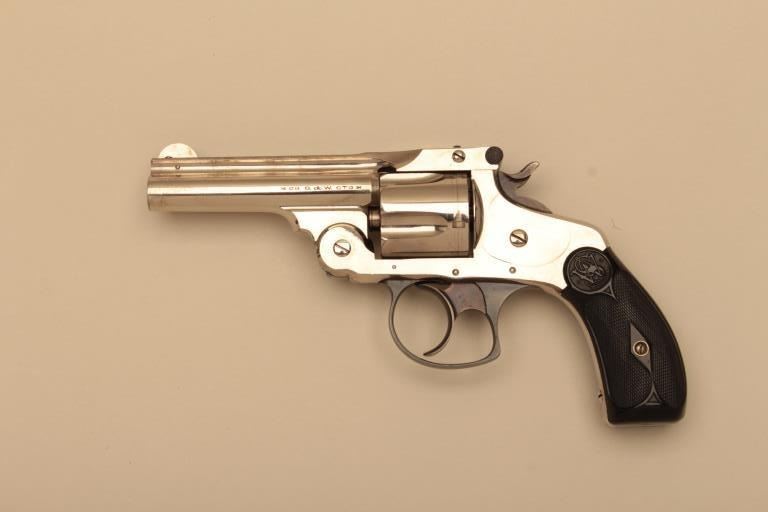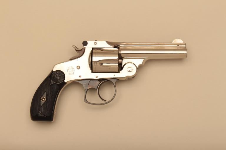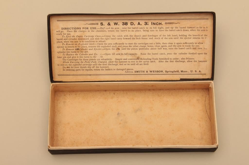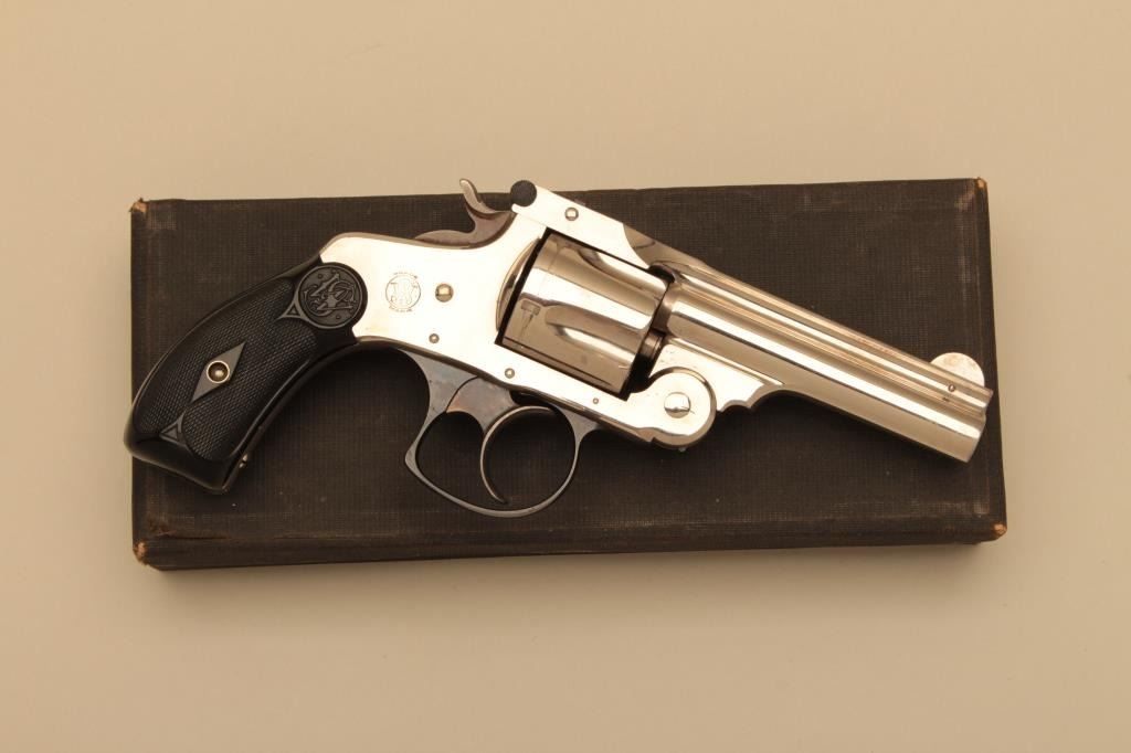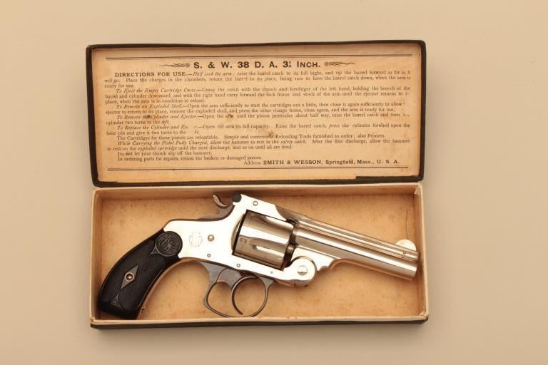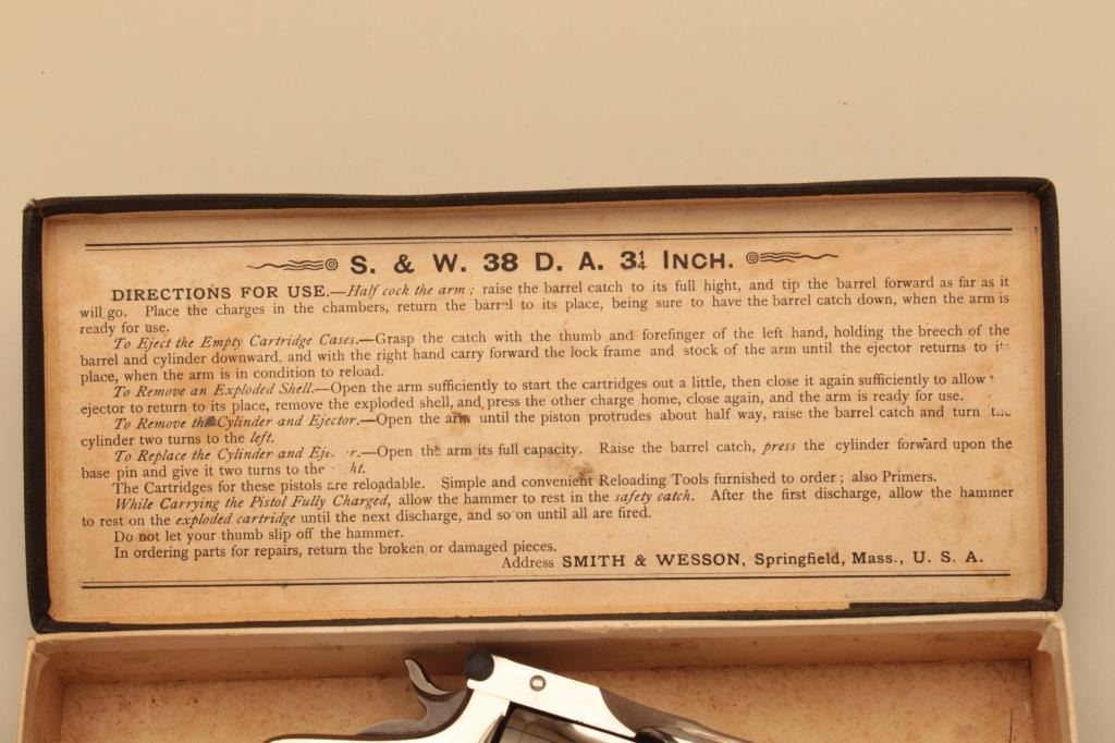 Smith & Wesson top break DA revolver, .38 S&W caliber, 3.25” barrel, nickel finish, checkered hard rubber grips, S/N 459395; in near new condition with only cylinder drag lines; accompanied by a fabric coveredcardboard box with instructions printed inside the lid. (C&R). Est.: $400-$800.