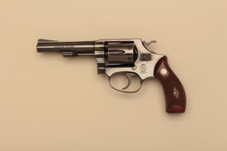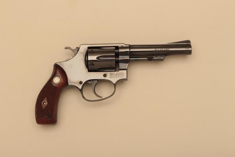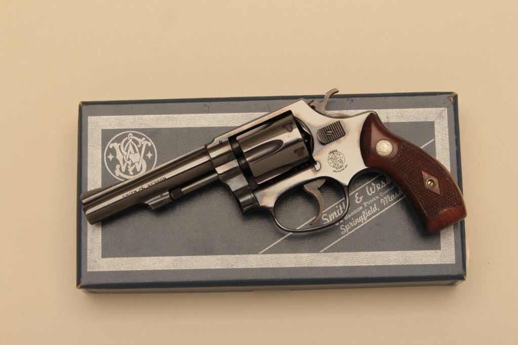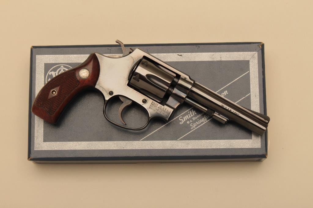 Smith & Wesson Model 30-1 DA revolver, .32 S&W Long caliber, 4” barrel, flate latch, blued finish, checkered wood medallion grips, S/N 748931, in like new condition with factory two piece cardboard box, end labelnumbered to this gun and instructions sheet. (C&R). Est.: $500-$1,000.