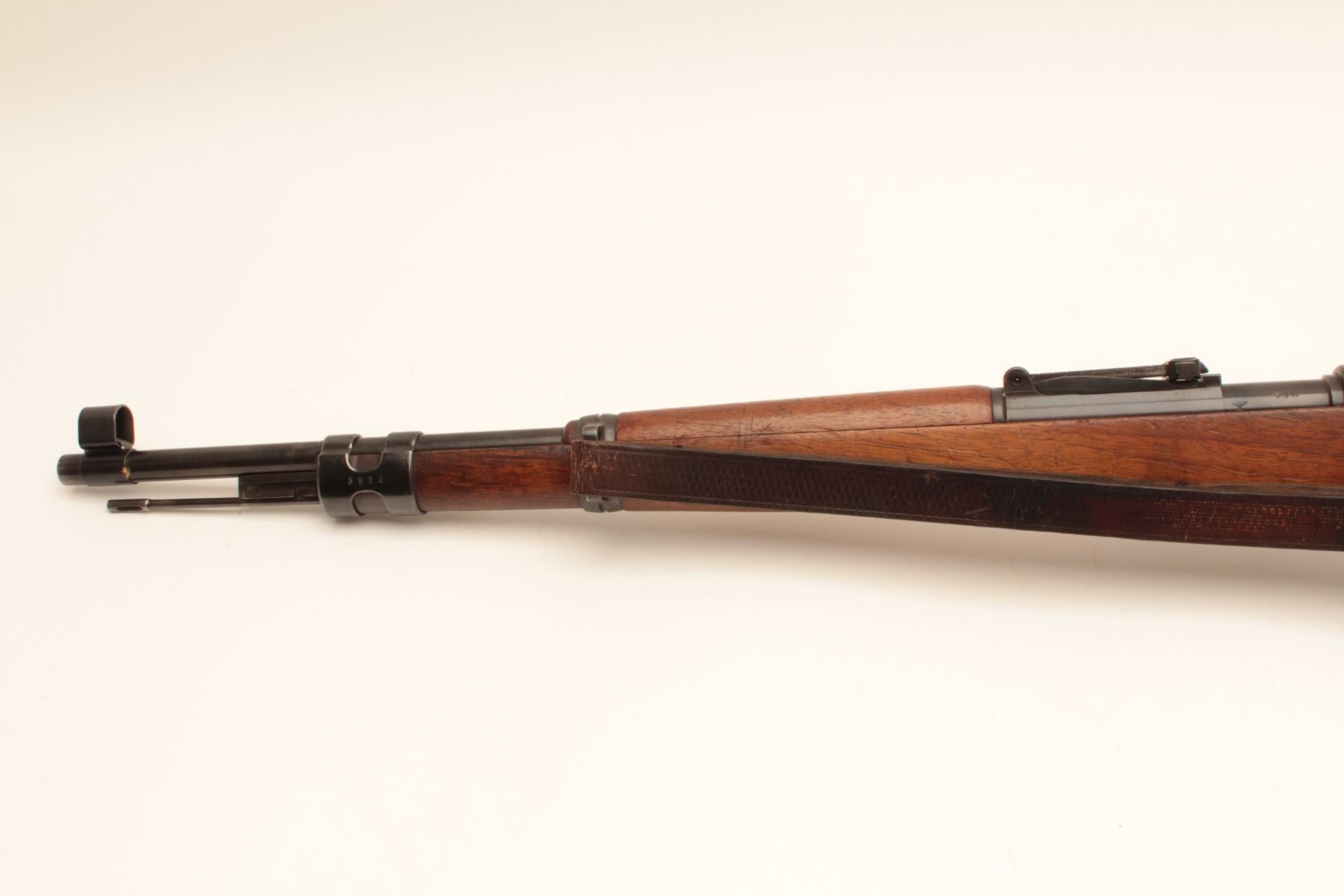 Unusual Model 1941 Portuguese Mauser bolt action rifle, 7 x 57mm caliber, 24” barrel, blued finish, wood stock, nazi-marked, no import markings visible, S/N H13524, with leather sling; overall very good to near fine condition with near fine bore, crisp action, sharp markings and very good stock; with document from consignor that includes “The M1941 contract was signed July 15, 1941 for 50,000 rifles, to be delivered in 10 batchesof 5,000. But serial numbering had some problems. The first 4 batches had consecutive numbers, but after 23,000 rifles, the Germans made an emergency requisition that interrupts the serial number sequence.The remaining batches are delivered with serial numbers from F to I, and only H batch would have complete and consecutive numbers. This particular rifle went to Portugal rather than being held by the Germans”. (C&R). Est.: $400-$800+.