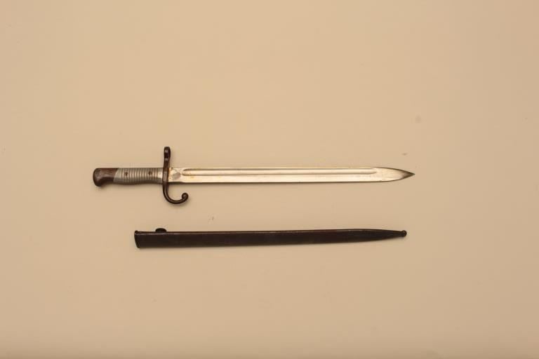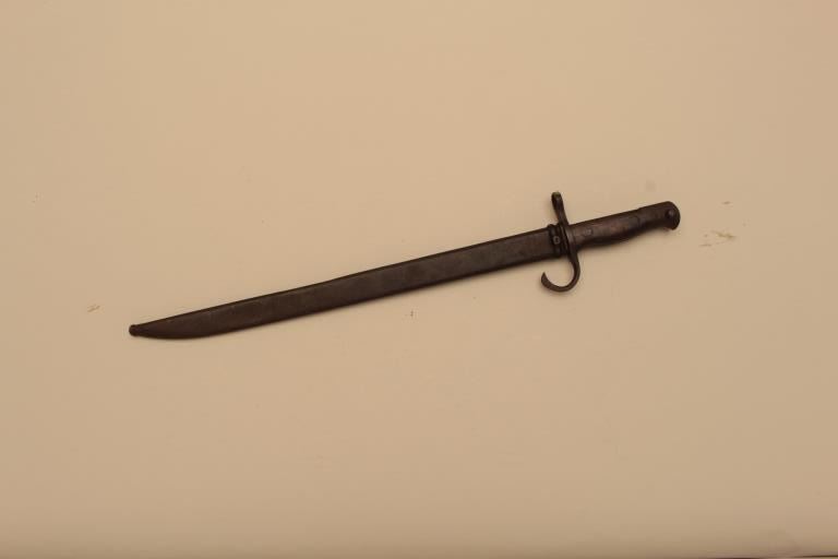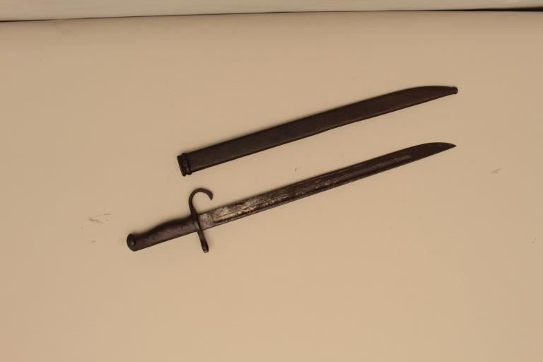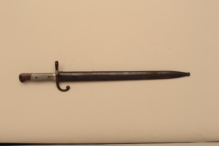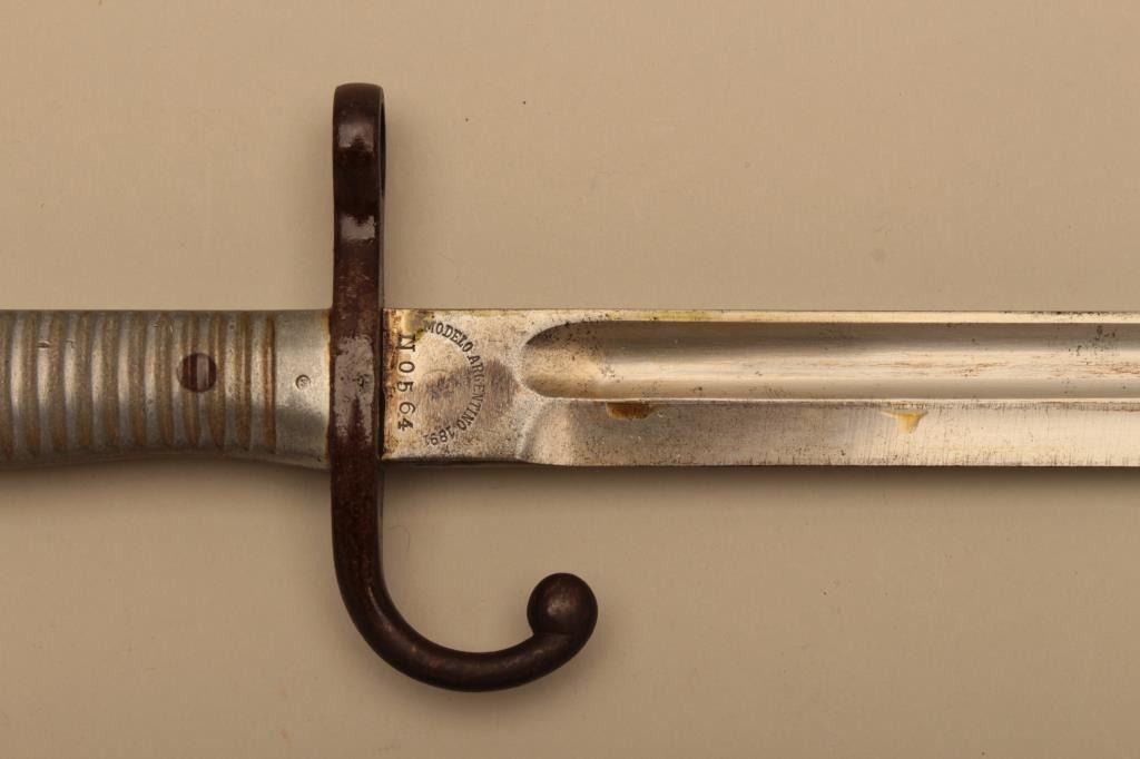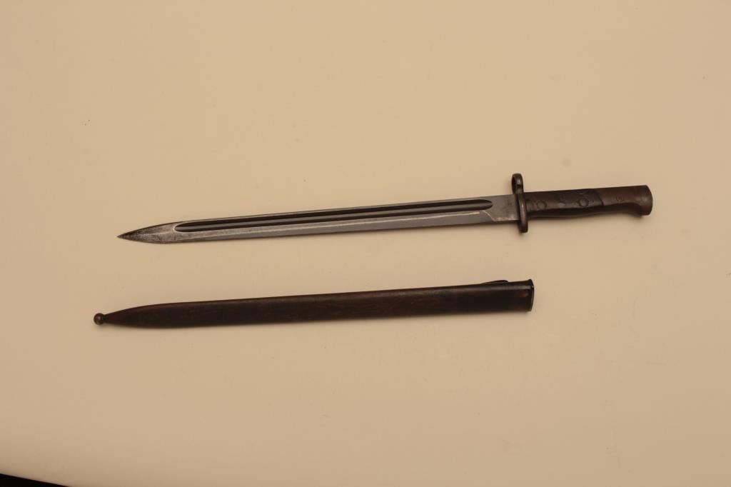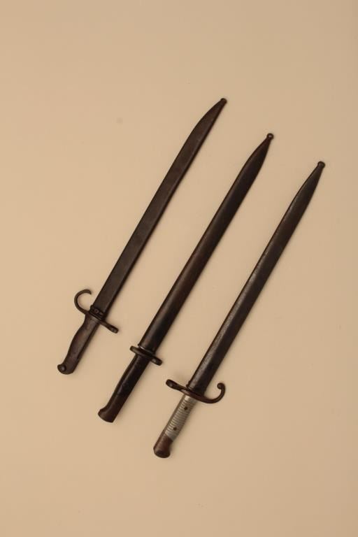 Lot of three WWII era bayonets. The lot includes a Japanese Arisaka bayonet measuring 20 ½”in overall length with a 16” blade. The blade has taken on a dark brown patina, is arsenal Kokura and does appear to havebeen sharpened. The smooth wood grips show wear and use, while the steel scabbard shows heavy wear with light to moderate surface rust. The lot also includes an Argentine bayonet marked, “MODELO ARGENTINO 1891” andSolingen on the other side, Serial #N0564. The blade is in nearly fine condition showing little use. The overall length is 21” with a 16” blade. The handle is constructed of ribbed steel. The steel scabbard is in goodcondition with a dark brown patina. The third and final bayonet is of British manufacture with an overall length of 20 ½” with a 15 ½” blade. The blade is in good overall condition with light surface erosionand the smooth wood handle shows mars and compressions from use. The steel scabbard shows an overall brown with light to moderate surface rust. Est.: $100-$200.