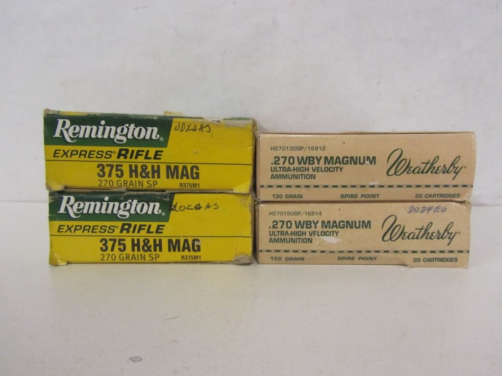 TWO 20 ROUND BOXES OF REMINGTON 375 H&H MAG 270GR SOFT POINT, ONE 20 ROUND BOX OF WEATHERBY 270 WBY MAG 130GR SPIRE POINT, ONE 20 ROUND BOX OF WEATHERBY 270 WBY MAG 150GR SPIRE POINT.