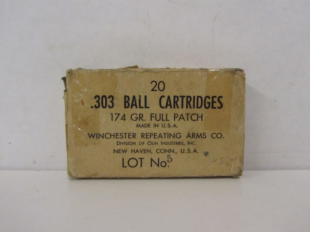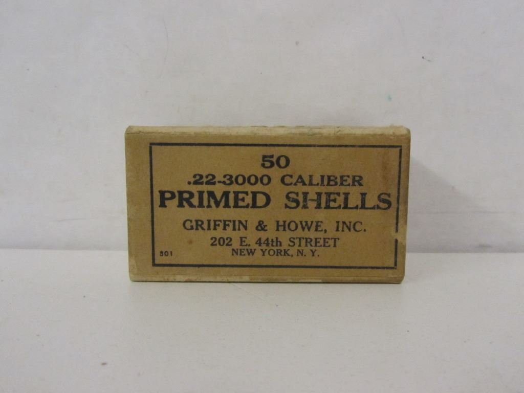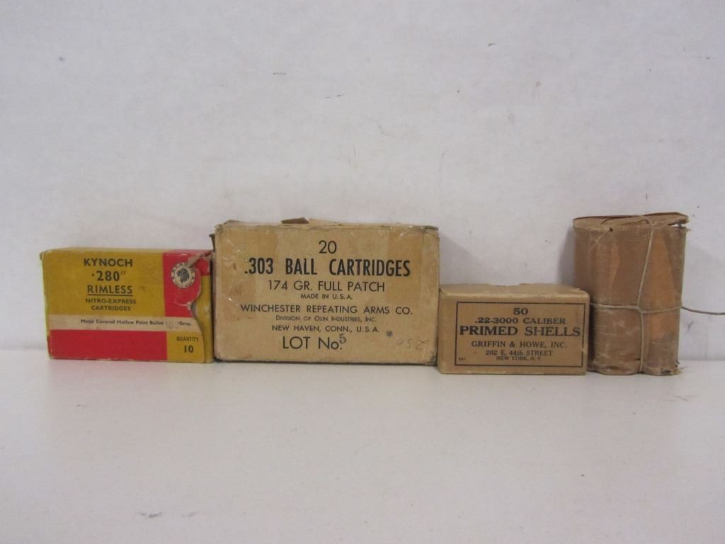 ONE PACKAGE OF 7.62X54R UNKNOWN QUANTITY OF ROUNDS, ONE 50 PIECE BOX OF GRIFFIN & HOWE 22-3000CAL PRIMED BRASS, ONE BOX OF WINCHESTER 303 BALL CARTRIDGES 174GR FULL PATCH WITH 11 ROUNDS INSIDE, ONE 10 ROUND BOX