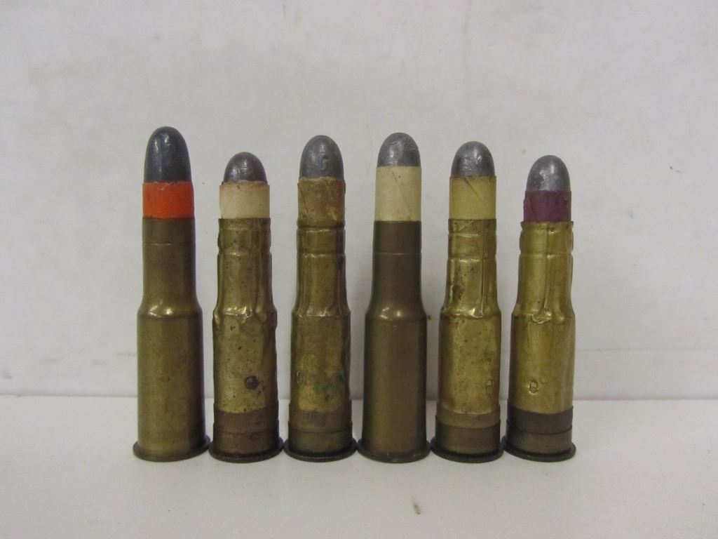 THREE 577/450 COILED BRASS PAPER PATCHED BULLETS, ONE MARTINI ENFIELD 577/450 KYNOCH COILED BRASS PATCHED LEAD BULLET, ONE 577/450 SOLID BRASS CASES PAPER PATCHED BULLET, ONE 577/450 COILED BRASS PURPLE PAPER PATCHED