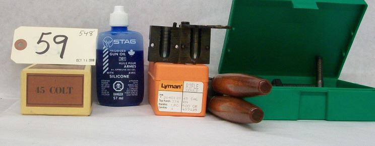 RCBS bullet puller withw/o coleet for .45, .338 & 6mm, Lyman .45 cal. 500 gr bullet mould, bullet mould handles, Stag frigidized gun oil, empty 45 colt shell box