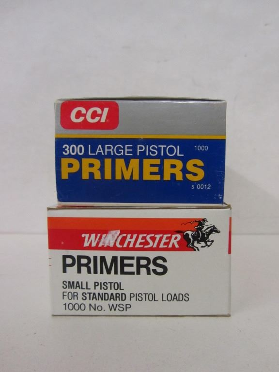 ONE 1000 PIECE BOX OF WINCHESTER SMALL PISTOL PRIMERS FOR STANDAR PISTOL LOADS, ONE 300 PIECE BOX OF CCI LARGE PISTOL PRIMERS.