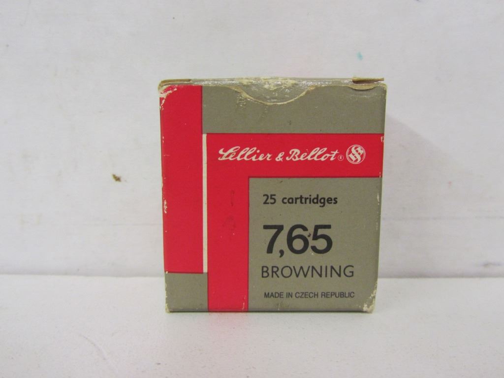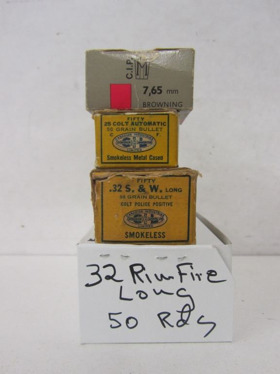 ONE BOX OF SELLIER & BELLOT 7,65MM BROWNING 73GR FMJ WITH 21 ROUNDS INSIDE, ONE 50 ROUND BOX OF C-I-L DOMINION 25 COLT AUTO 50GR FMJ, ONE 50 ROUND BOX OF C-I-L DOMINION 32 S&W LONG 98GR LEAD BULLETS, ONE 50 ROUND BOX OF