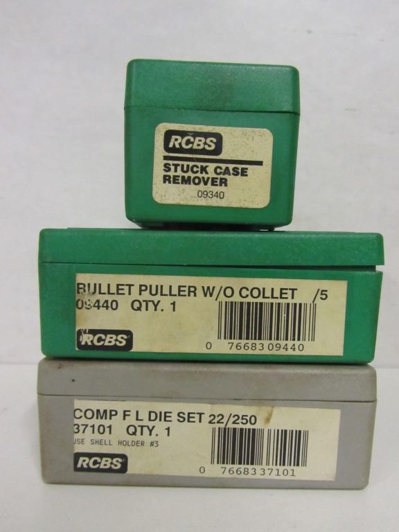 ONE SET OF RCBS 22/250 RELOADING DIES #37101, ONE RCBS BULLET PULLER W/O COLLET #09440, ONE RCBS STUCK CASE REMOVER 09340, ONE CHAPMAN GUN SCREW DRIVER KIT NO.9600, ONE MTM CASE GUARD 150.