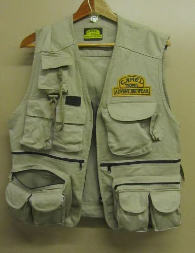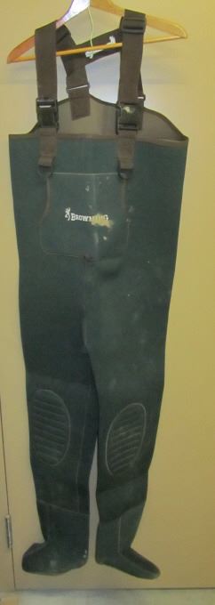 ONE PAIR OF SNOW PANTS SIZE LARGE, ONE PAIR OF BROWNING NEOPRENE STOCKING FOOT WADERS, ONE CAMEL TROPHY SHOOTING VEST WITH VARIOUS SURVIVAL ACCESSORIES IN POCKETS