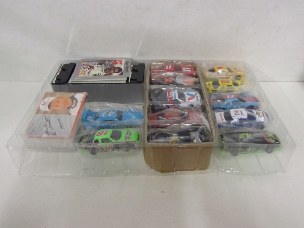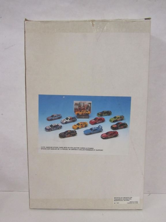 12 NASCAR DIE CAST STOCK CARS WITH STANDS AND 30 COLLECTOR CARDS. CARS ARE ALL STILL WRAPPED IN ORIGINAL PLASTIC