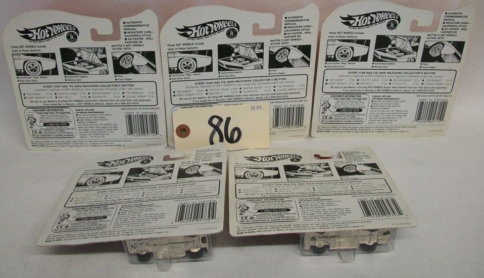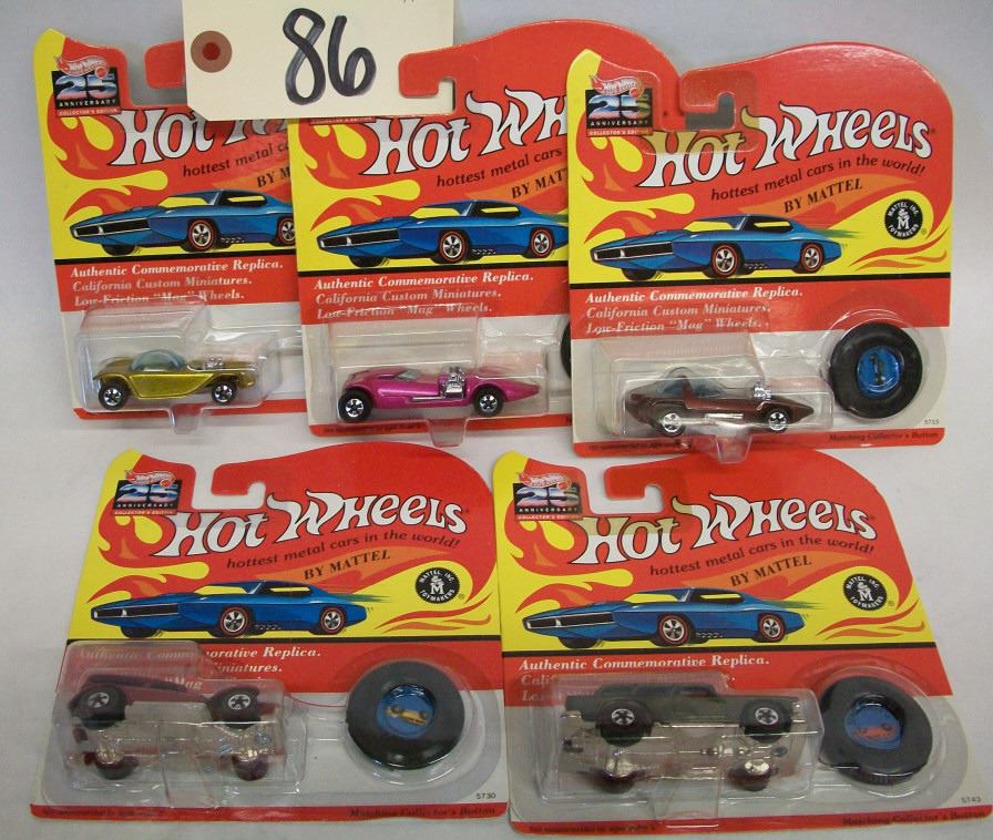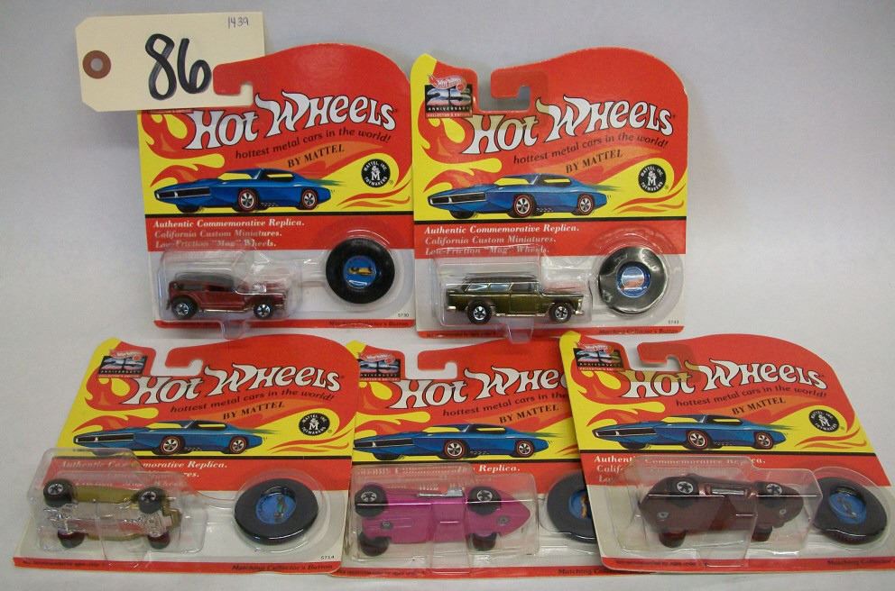 Hot Wheels 25th Anniversary Die Cast Cars-Series H (1993) 1:64 size, in packages Set of 5 Nomad (5743) Olive, with Matching Collector's Beatnik Bandit (5714) Gold, with Matching Collector's Button Twin Mill (5709) Pink, with Matching Collector's Button