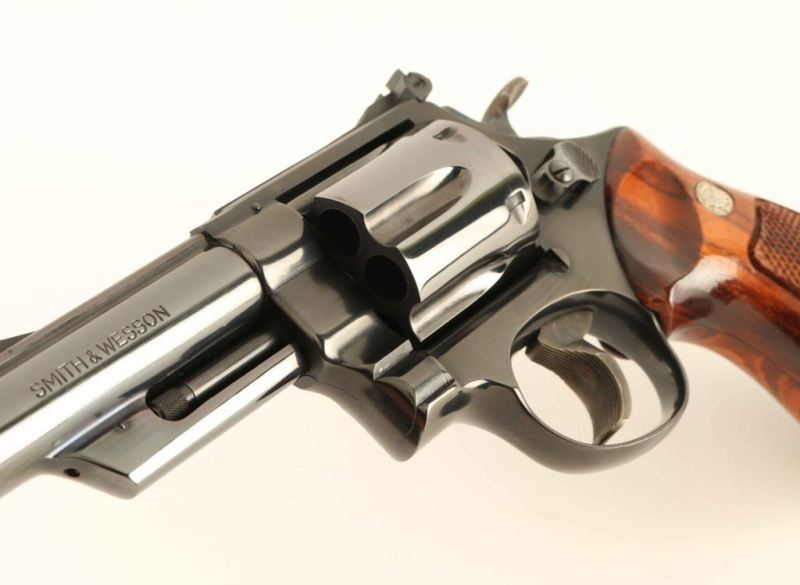 'The .44 Magnum' Large frame double action revolver chambered in .44 Magnum, manufactured circa 1980. Features a blued finish, pinned 4" heavy barrel with partially serrated wide sighting rib, raised ramp front sight with red insert, adjustable micrometer click rear sight with white outline, fluted six-shot cylinder with counterbored chambers, shrouded ejector rod, serrated .500 target trigger, .500" target hammer, three screw square butt N target frame with ten-groove grip straps and two-piece checkered Goncalo Alves target grips with silver S&W medallions. Includes a cardboard shipping box with a blue two-piece cardboard box containing documents, paper & tools and a factory wood presentation case with fitted black plastic insert. Revolver exhibits approximately 98% of it's original blued finish showing a thin drag line on the cylinder and a scratch on the right side of the frame & barrel. Action is smooth with very good lock-up, the bore is pristine, and the wood grips are fine. Condition is near NRA Perfect in case. ***Modern Firearm***