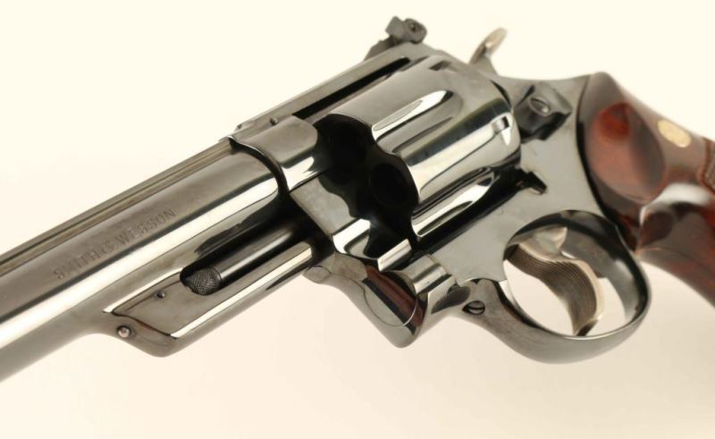 'The .44 Magnum' Early large frame double action revolver chambered in .44 Magnum, manufactured circa 1950's. Features a polished blued finish, pinned 6 1/2" heavy barrel with partially serrated wide sighting rib, raised ramp front sight with red insert, adjustable micrometer click rear sight with white outline, fluted six-shot cylinder with counterbored chambers, shrouded ejector rod, .500 serrated target trigger, .500" target hammer, five screw square butt N target frame with six-groove grip straps and two-piece diamond checkered Goncalo Alves 'coke bottle' target grips with silver S&W medallions. Includes a factory velvet lined locking wood presentation case. Revolver exhibits approximately 99% of it's exceptional factory blued refinish showing a faint drag line on the cylinder and a small scratch on the sideplate near the forwardmost screw. Action is smooth with very good lock-up, the bore is pristine, and the wood grips are near fine with few small blemishes. Condition in NRA Excellent in case as restored. ***C&R Firearm***