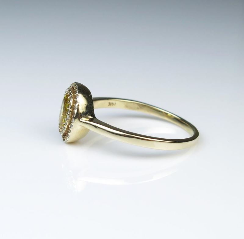 Features a center yellow Sapphire weighing approx. 1.00 carat and micro set iwth over 50 fine cut Diamonds weighing approx. 0.40 carats of G-H colors and VS clarity in a 14K yellow gold setting.