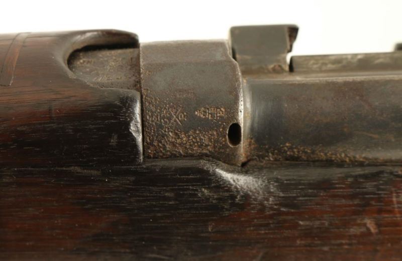 Scarce British military magazine fed bolt action service rifle chambered in .303 British. Manufactured in 1922 with only 20,000 produced. Features a blued finish, 25.2" barrel, raised patridge front sight, receiver mounted folding rear sight graduated to 1,400 yards, metal nosecap with bayonet lug & protective sight ears, two barrel bands, serrated trigger, detachable 10 round magazine with cut-off on the right side of the receiver, manual safety on the left side of the receiver, green canvas sling, charge loading bridge on the receiver, full length hand guard, forend, straight grip shoulder stock and brass trapdoor buttplate with oiler. The right side of the butt socket is marked "[crown]GR/ENFIELD/1922" & Sht L E/V." The barrel shows nitro proof marks and the receiver is stamped "ENGLAND." Serial numbers match on the receiver and nose cap. Rifle retains approximately 70% of its blued finish showing even wear with some scattered surface rust & pitting. Action is smooth, the bore is bright with sharp rifling & some pitting at the 6 0' clock position, and the wood stocks are very good with mild blemishes. Condition is near NRA Very Good ***C&R Firearm*** From The John F Sukey Collection