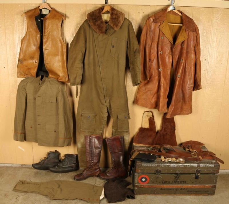 Circa 1918 Including;tunic with wings and insignia in breast pocket, officer's trousers, leather flight jacket, leather helmet with goggles, flight suit lined in shearling, leather flight boots, Leather boots with riding spur (40 lace eyes), wool lined flight vest dated 6 Sept 1917, mittens, fur gauntlets, and hood liner. Trunk reads Capt. H.J. Pfiester, Air Service A.E.F. (American Expedition Force) Cincinnati, Ohio'.