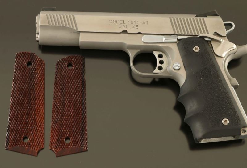 Stainless steel 1911A1 pattern single action semi-automatic pistol chambered in .45 Auto. Features a brushed/matte finish, 5" stainless steel match grade barrel with loaded chamber viewing window, two-piece N.M. full length guide rod, dovetailed low-profile three-dot night sights, front & rear cocking serrations on the slide, serrated adjustable trigger, skeletonized hammer with serrated spur, ambidextrous manual safety on the frame, extended beavertail grip safety, push button magazine release, no magazine, serrated flat mainspring housing with internal locking safety, beveled magazine well and one-piece pebbled black rubber Hogue wrap-around finger groove grip. Includes a factory hard case with manual, flag, tools, keys, a pair of checkered Cocobolo grips and the OEM Novak's low-profile sights. Pistol exhibits light handling marks and bright rubs/scratches near the take-down pin with no major wear observed. Action is very smooth, the bore is excellent and the rubber grips are fine. Condition is near NRA Excellent in case. ***Modern Firearm***