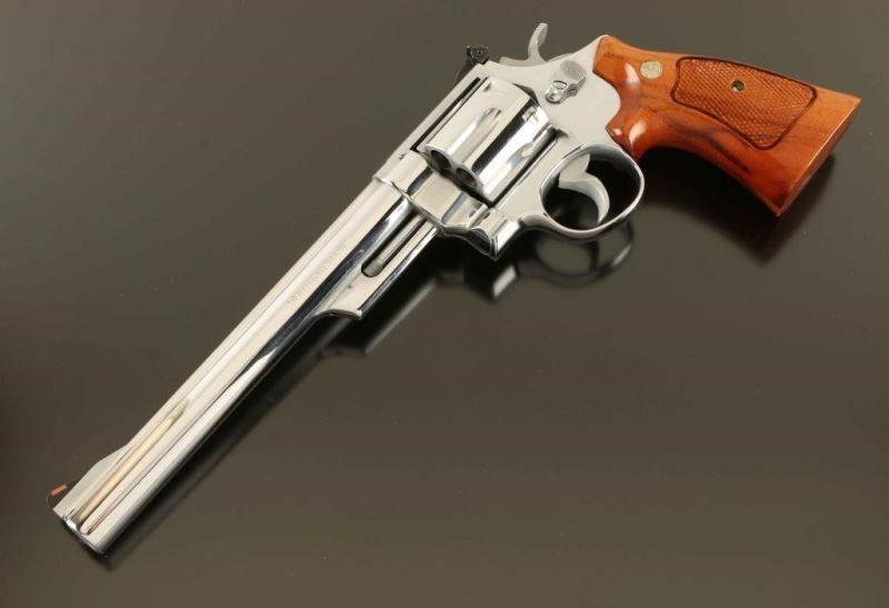 'The .44 Magnum' Large frame double action revolver chambered in .44 Magnum, manufactured circa 1980. Features a bright nickel plated finish, pinned 8 3/8" heavy barrel with partially serrated wide sighting rib, raised ramp front sight with red insert, adjustable micrometer click rear sight with white outline, fluted six-shot cylinder with counterbored chambers, shrouded ejector rod, serrated .500 target trigger, .500" target hammer, three screw square butt N target frame with ten-groove grip straps and two-piece checkered Goncalo Alves target grips with silver S& W medallions. Includes a factory wood presentation case with blue cloth lined fitted interior, screwdriver cleaning tools. Revolver exhibits nearly all of it's nickel plated refinish showing a thin drag line on the cylinder with no other observed wear. Action is smooth with very good lock-up, the bore is pristine, and the wood grips are fine.