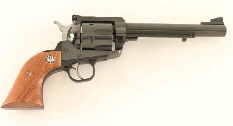American made single action six-shot revolver chambered in .41 Magnum, manufactured circa 2004. Features a blued finish, 6 1/2" barrel, raised ramp front sight, adjustable rear sight, ejector rod, fluted cylinder, smooth wide trigger, serrated hammer spur, transfer bar safety, black anodized aluminum alloy grip frame and two-piece smooth wood grips with Ruger medallions. Revolver exhibits approximately 98%+ of it's original finish showing a light drag line on the cylinder and a few minor handling marks. Action is smooth with good lock-up, the bore is pristine and wood grips are fine. Condition is excellent. ***Modern Firearm***