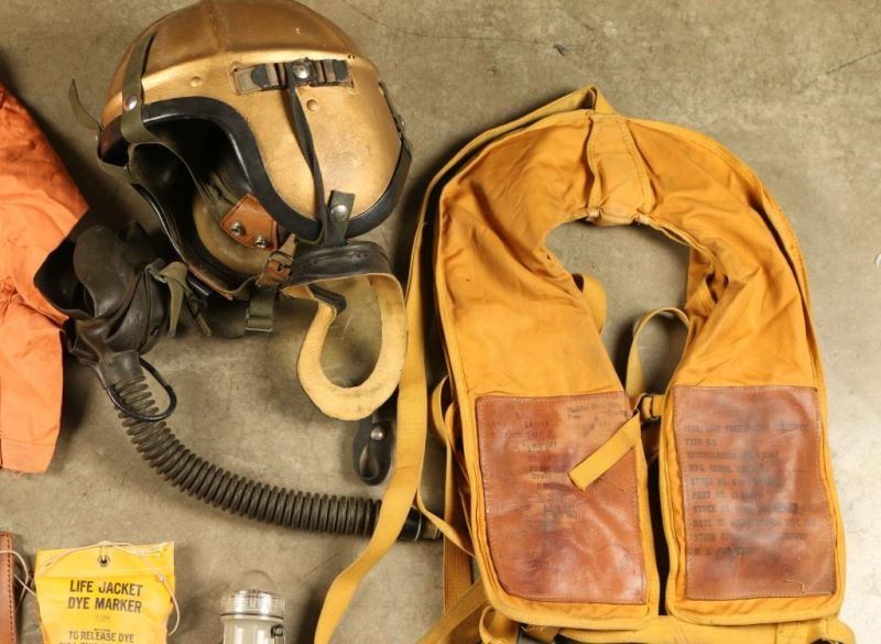 1951 Korea; including; metallic gold helmet with shield and mask, flight suit, life jacket die marker, leather gloves, B-5 life preserver, and style B-7 boots.