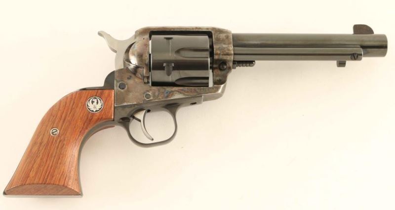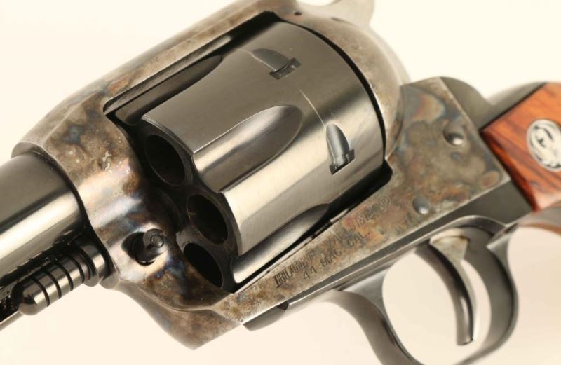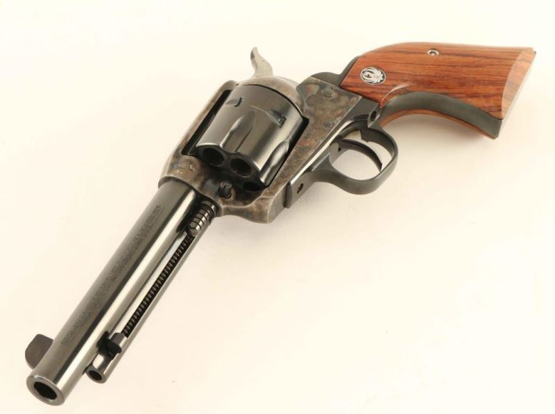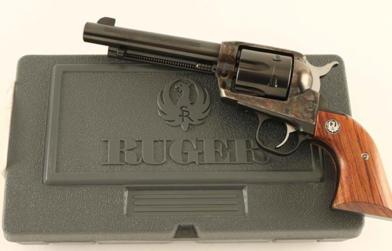 American made single action six-shot revolver chambered in .44 Magnum, manufactured circa 2004. Features a blued/case hardened finish, 5 1/2" barrel, blade front sight(which has been shortened slightly), square notched rear sight, ejector rod, fluted cylinder, smooth wide trigger, serrated hammer spur, transfer bar safety, and two-piece smooth wood grips with Ruger medallions. Includes the original factory hard case with documents and lock. Revolver exhibits approximately 85% of it's original finish showing a drag line on the cylinder and scattered losses on the frame. Action is smooth with good lockup, the bore is pristine, and the wood grips are near fine. Condition is NRA Very Good. ***Modern Firearm***