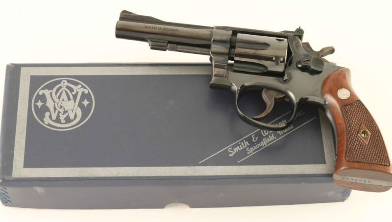 'The K-22 Combat Masterpiece' Medium frame double action revolver chambered in 22 Long Rifle, manufactured circa 1970. Features a blued finish, pinned 4" barrel with a serrated sighting rib, raised ramp front sight, adjustable micrometer click rear sight, non-shrouded ejector rod, fluted six-shot cylinder with counterbored chambers, serrated .265" trigger, .375" semi-target hammer, three screw square butt K target frame and two-piece diamond checkered walnut Magna grips with silver S&W medallions. Includes the original factory two-piece blue cardboard box with correct label, documents and paper. The revolver retains approximately 99%+ of it's original blued finish showing a faint drag line on the cylinder and no other apparent wear. Action is smooth with solid lock up, bore is pristine and the matching wood grips are fine. Condition is near NRA Perfect in box. ***Modern Firearm****
