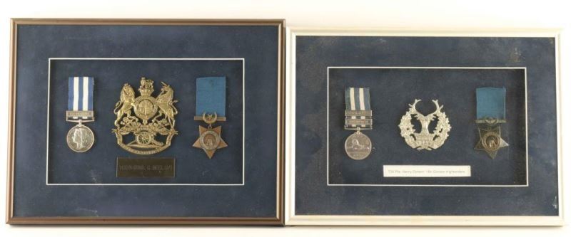 (1) '734 Pte. Henry Diment 1Bn Gordon Highlanders' Sudan war medals and star 1882 with dark blue mat background and single blue mat in silver frame measures 10 1/2"x14 3/4". Includes envelope with information on back. (1) '14135 GUNR. C. BEEL D/1' on brass title plate with star and medals on dark blue mat background with blue mat in gunmetal gray frame. Measures 10 7/8" x 14 3/8". From The John F Sukey Collection