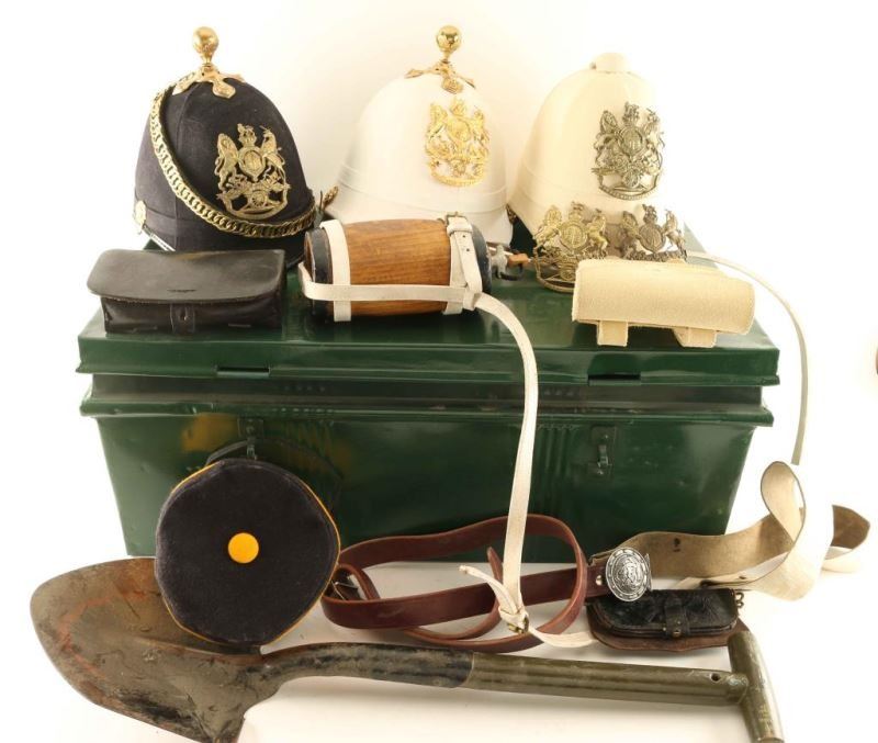 Hats, Belts, Bags, and Military shovel in a green chest. From The John F Sukey Collection