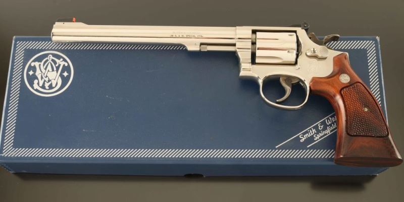 SN: BFM9150 #36 of 500 August edition of the "Twelve Revolvers" - a limited edition Ellett Brothers exclusive where a new revolver was released each month for the year of 1990 with an action scene & title inspired by early S&W advertisers. 'The K-38 Target Masterpiece' Medium frame double-action revolver chambered in 38 Special, manufactured circa 1990. Features a nickel plated finish, 8 3/8" barrel with partially serrated wide sighting rib, raised patridge front sight with orange bead, adjusted micrometer click rear sight, non-shrouded ejector rod, fluted six-shot cylinder, serrated .400" target trigger, .500" target hammer, three screw square butt K target frame and two-piece checkered Goncalo Alves target grips with silver S&W medallions. Includes the original factory two-piece blued cardboard box with tool, documents, parchment paper, cleaning tools and matching label. The revolver exhibits nearly all of it's original finish showing only a few minor handling marks and a very faint drag line on the cylinder. Action is smooth with tight lock up, the bore is pristine and the wood grips are near fine with what may be a crack in the right panel. Condition is near NRA Perfect in box. ***Modern Firearm****