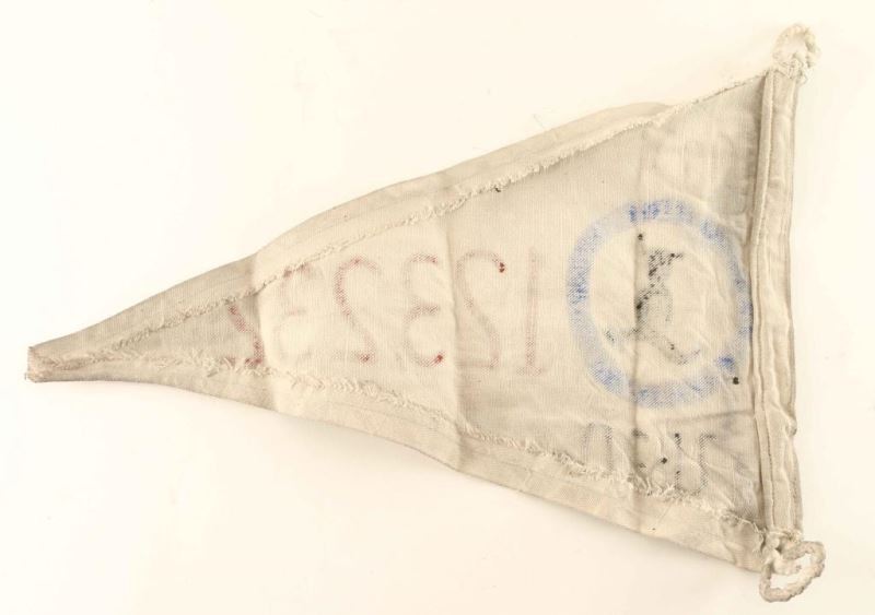 Submarine U-Boat Flotilla Tonnage Sunk Banner Flag. Measures 18 3/8” wide by 13 1/2” tall. Reads ‘(19) U-30 123,232’. Has the image of a bear on the left side. Hand painted on a beige canvas material. Has a rope on one end for attaching to a pole for hanging. Machine sewn construction. As is, unknown age.