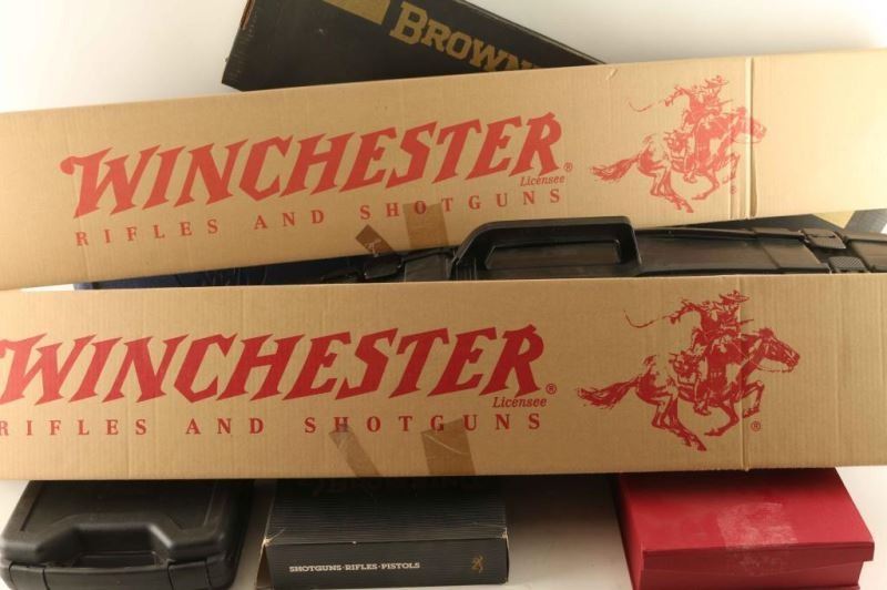 2 Winchester, 1 Browning Shotgun, 3 Pistol case. And one double rifle hard case