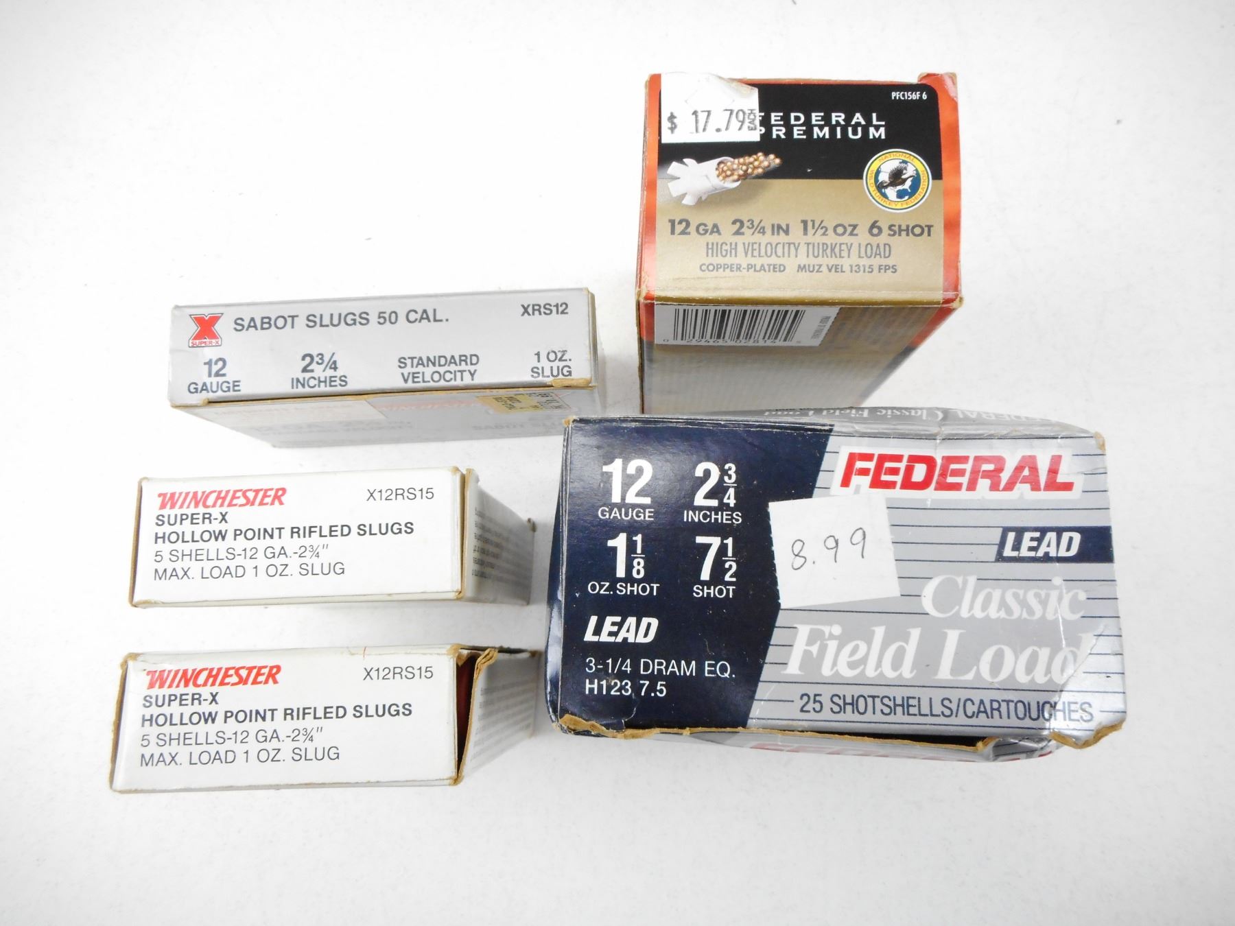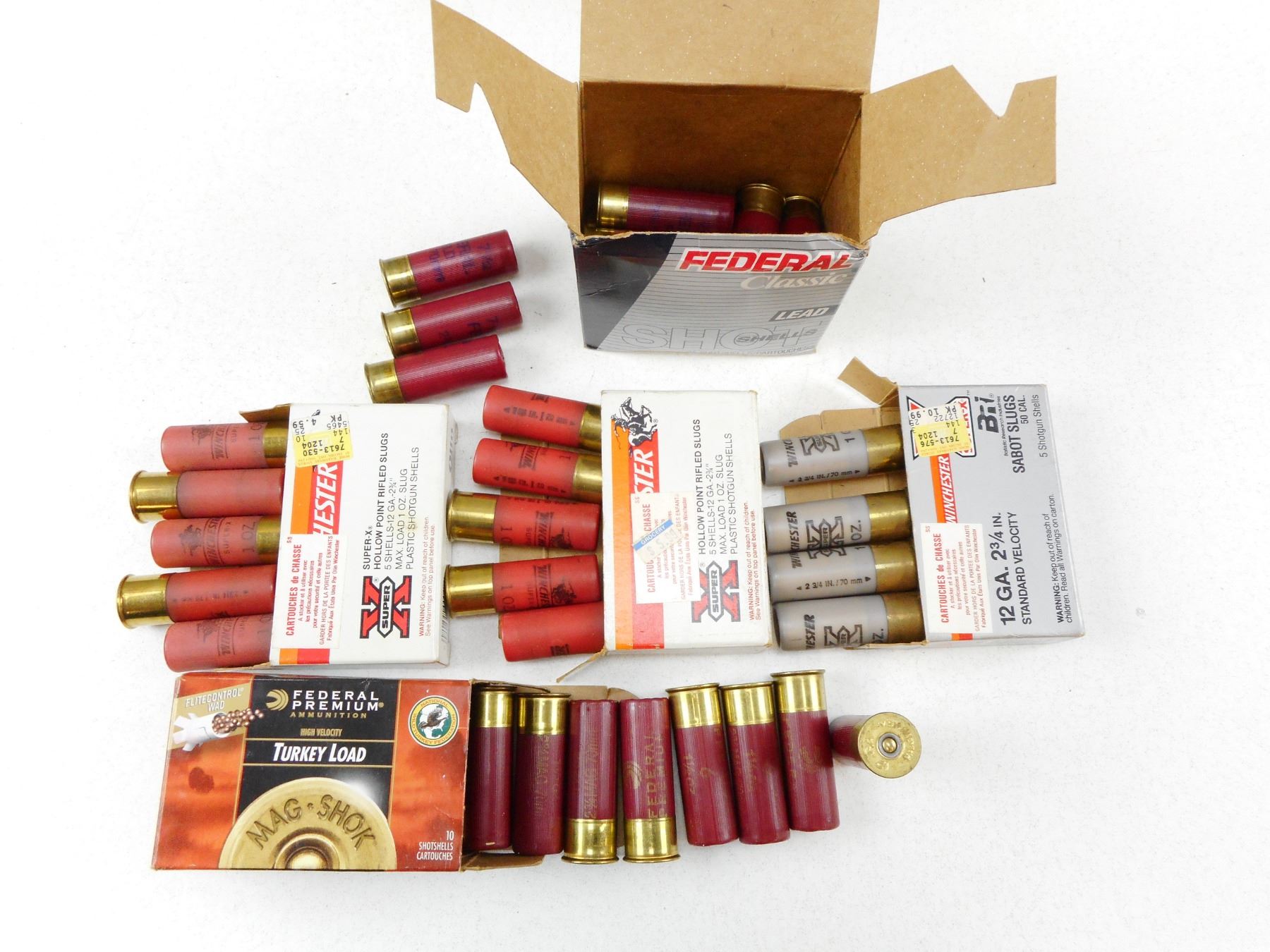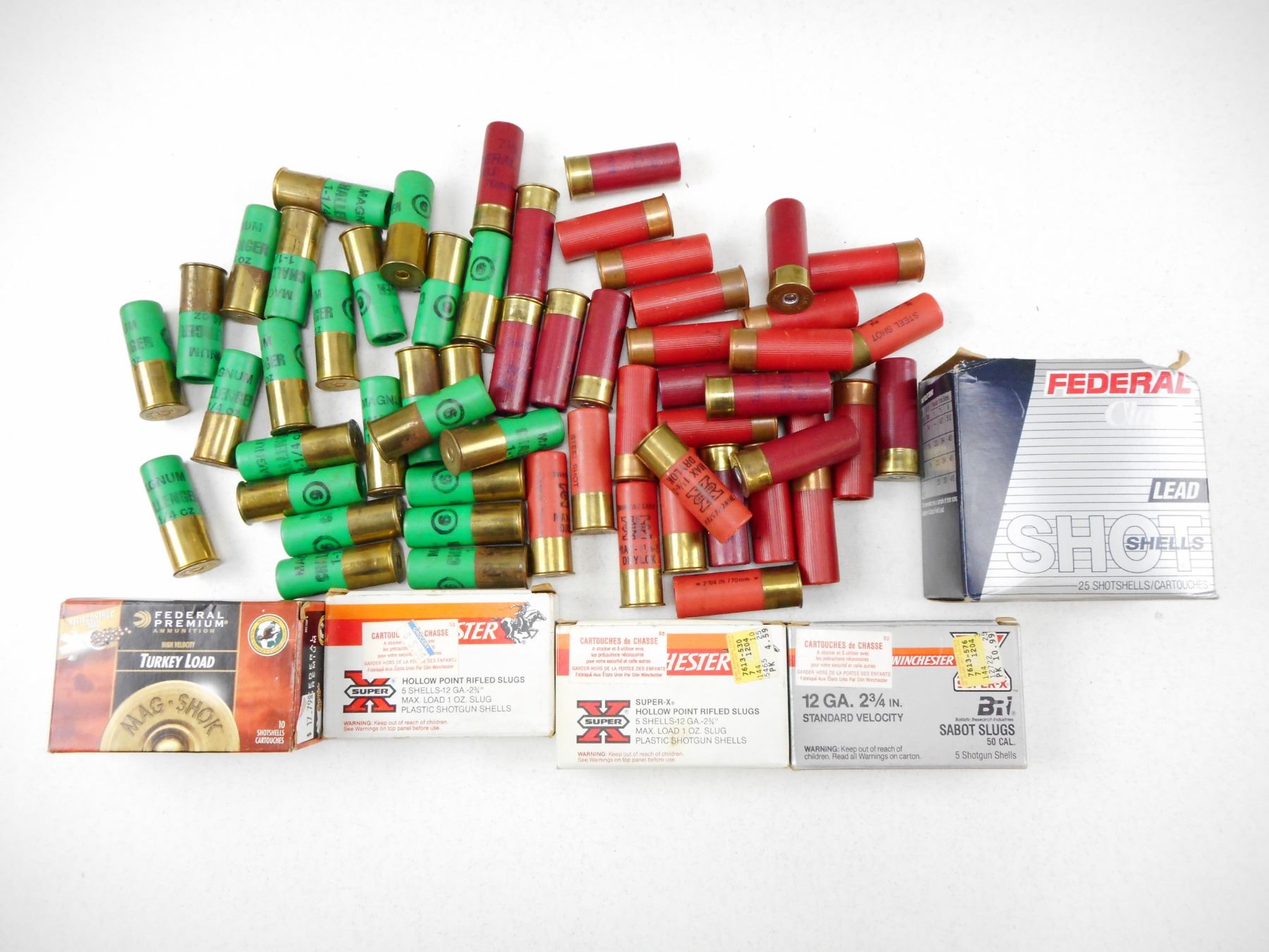 ASSORTED 12 GA 2 3/4" SHOTGUN AMMO , 93 RNDS INCLUDES TURKEY LOADS, LEAD 7 1/2 SHOT, RIFLED SLUGS AND ASSORTED SHOT
