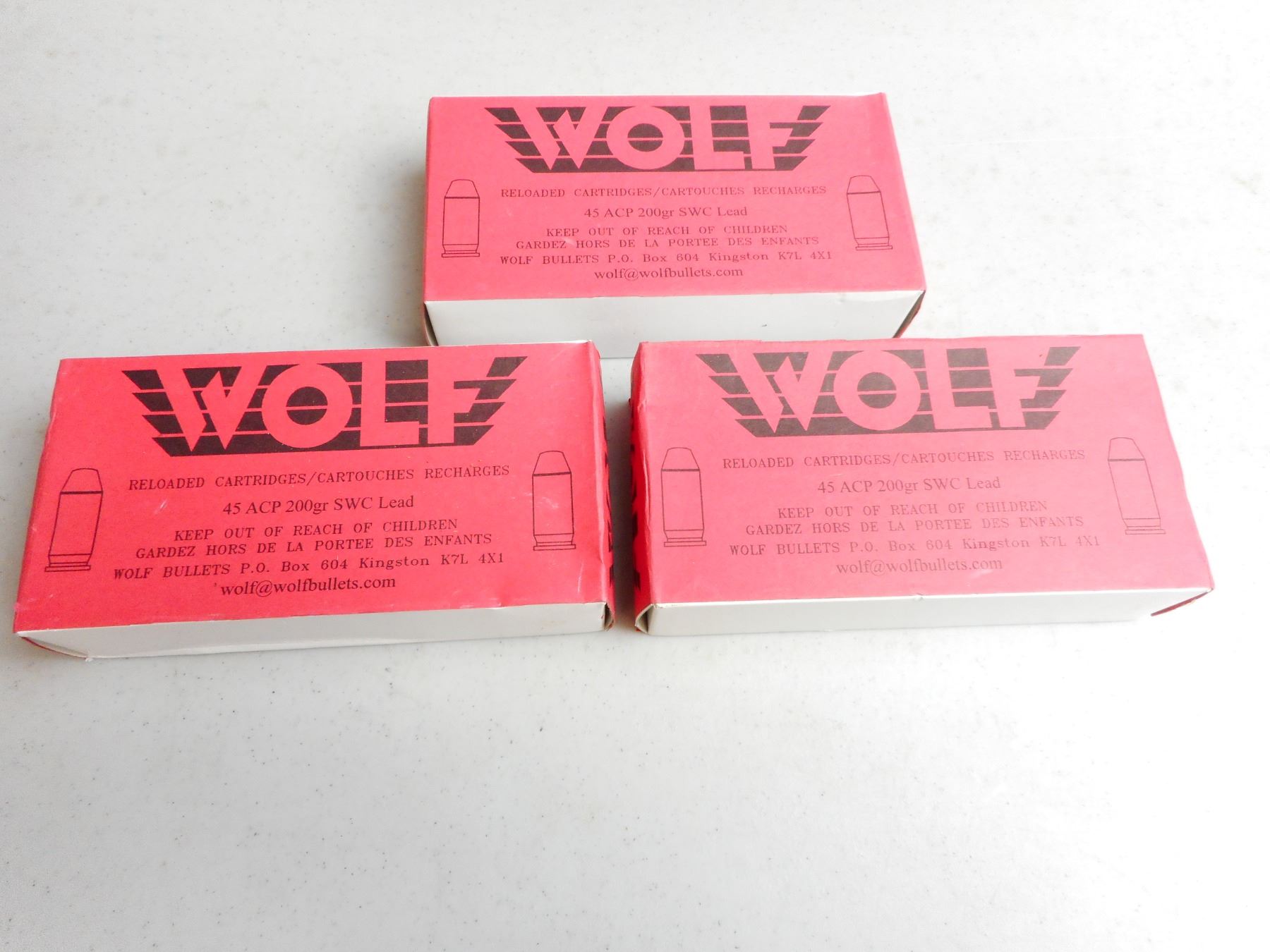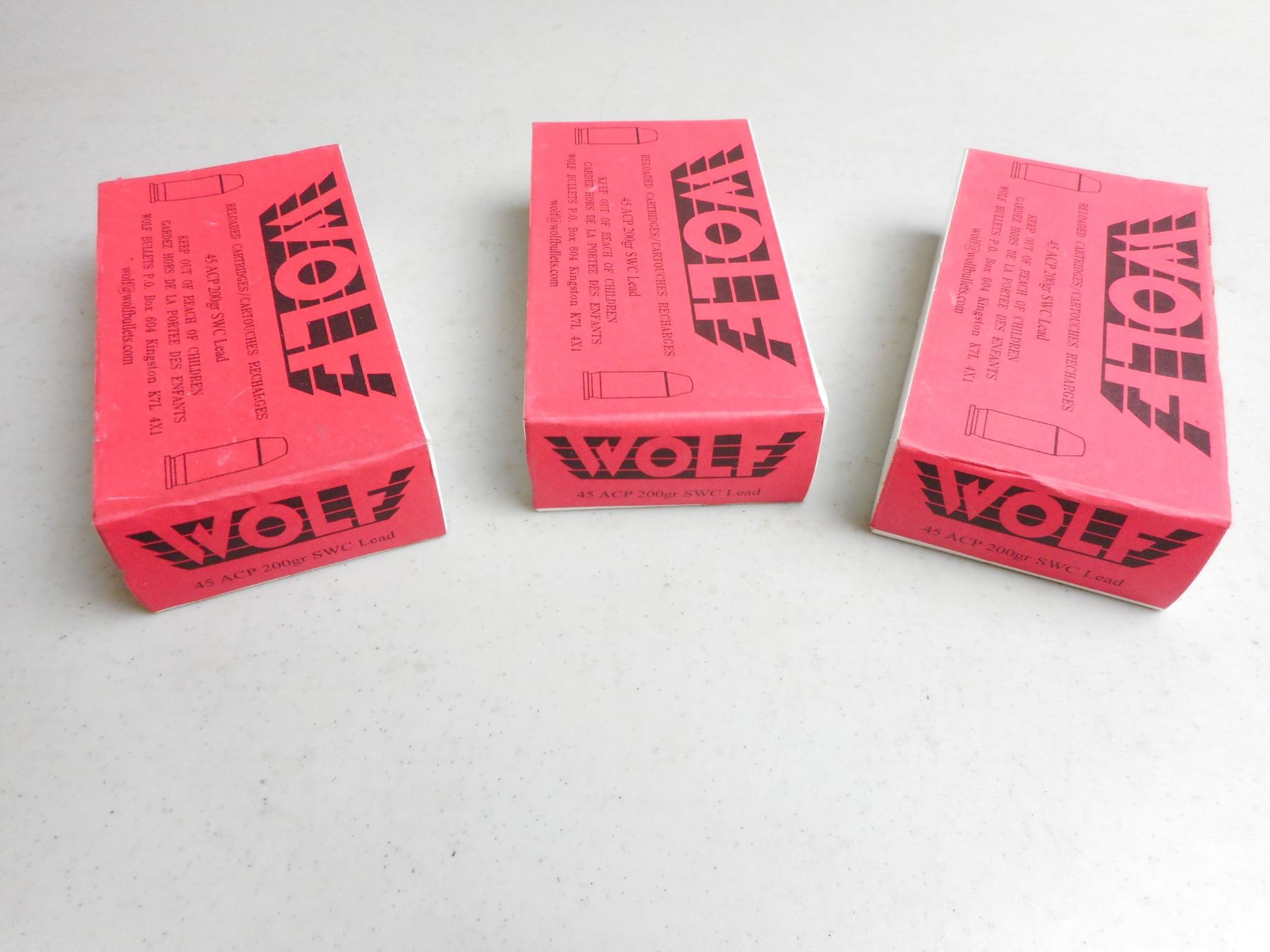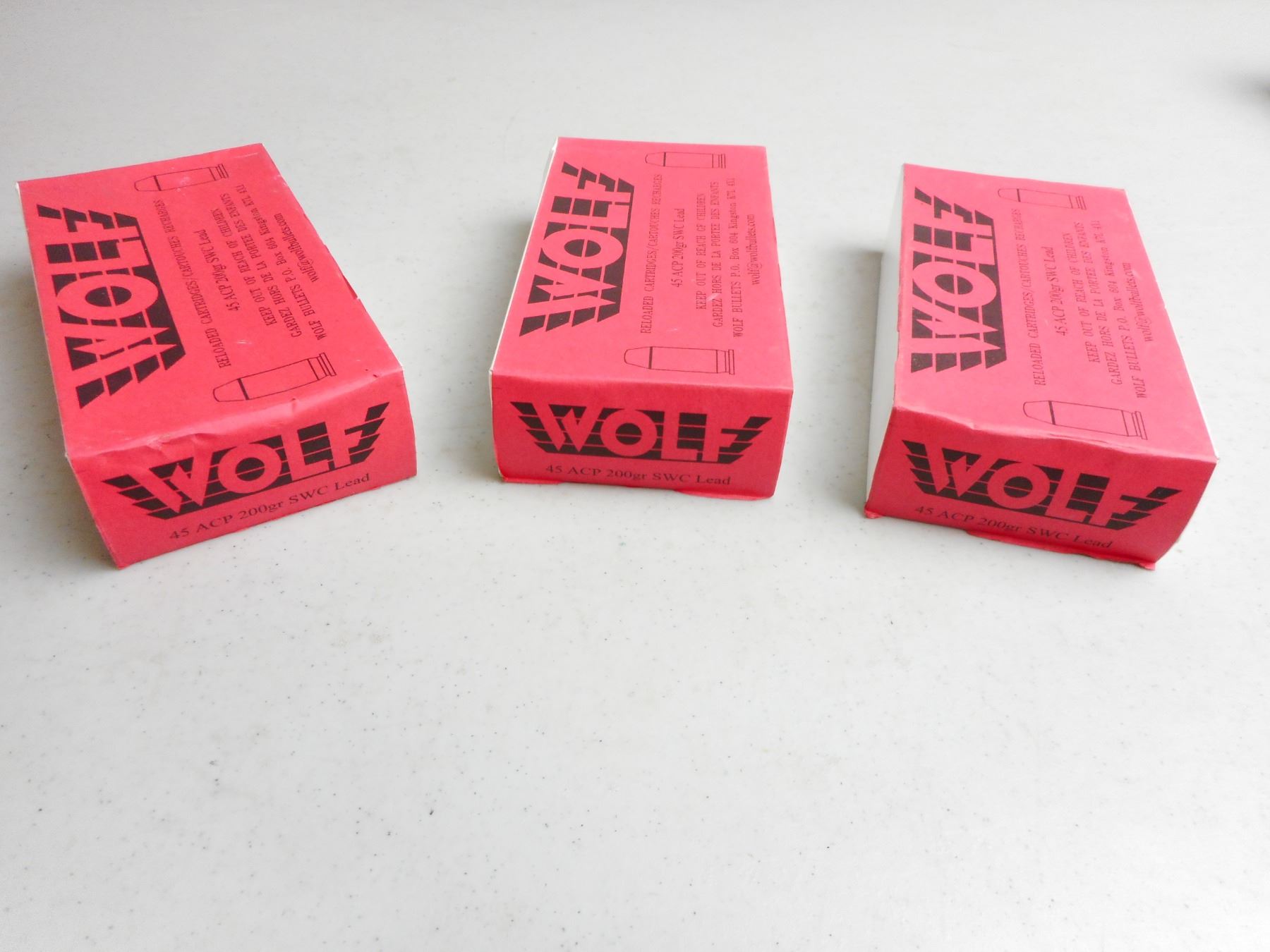 WOLF RELOADED CARTRIDGES 45 ACP AMMO , 150 RNDS 200 GRAIN SWC LEAD, SEALED BOXES