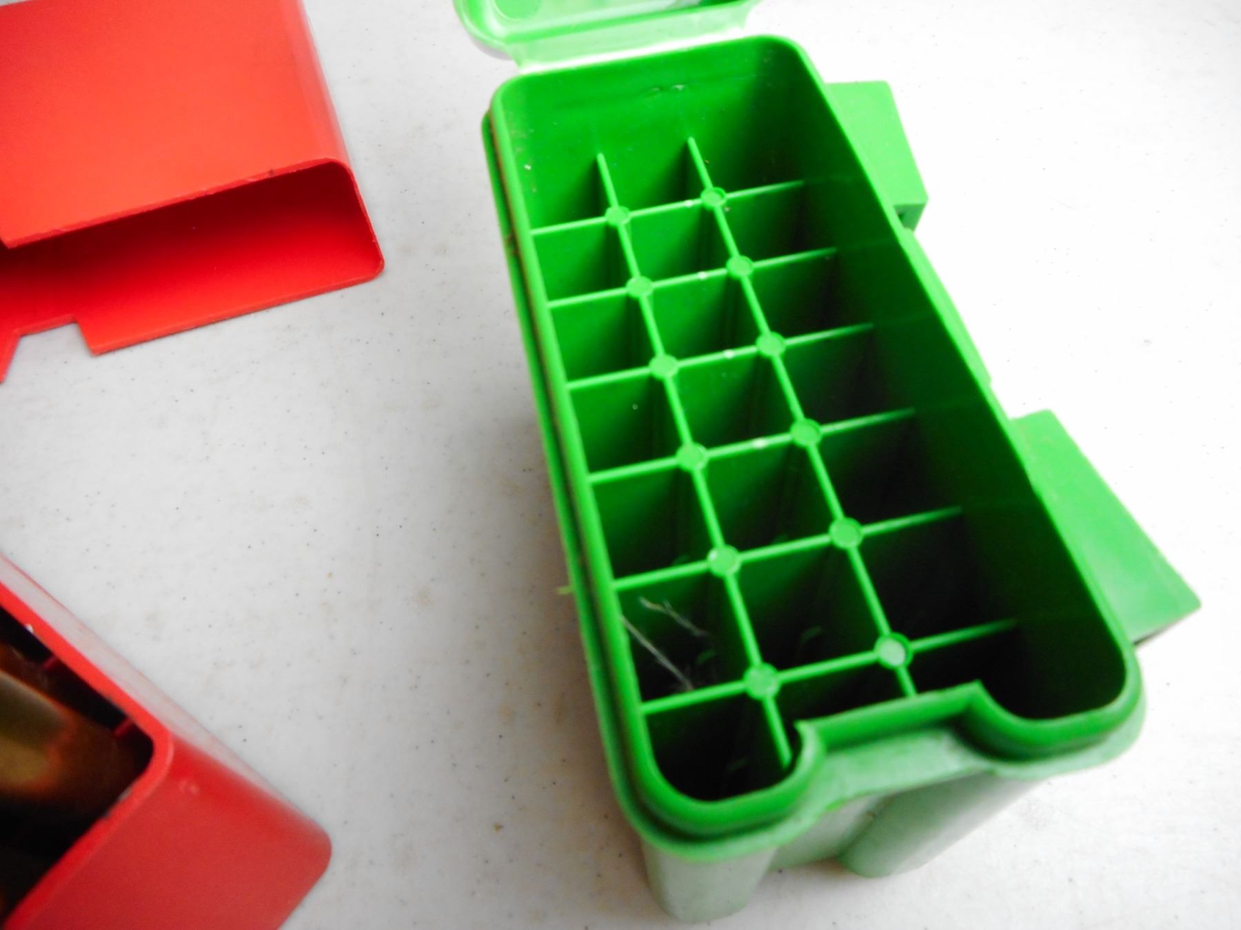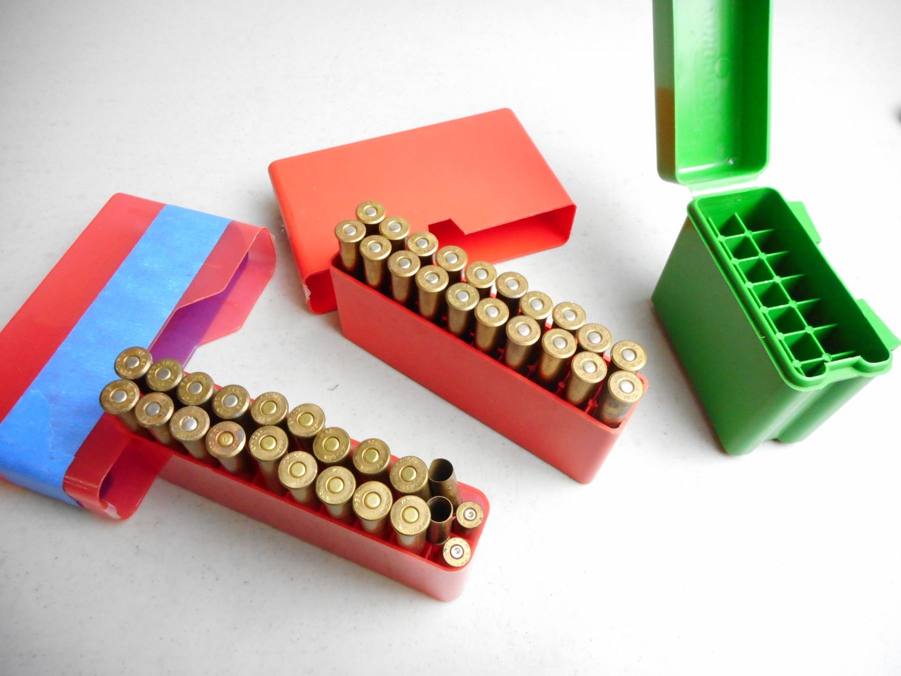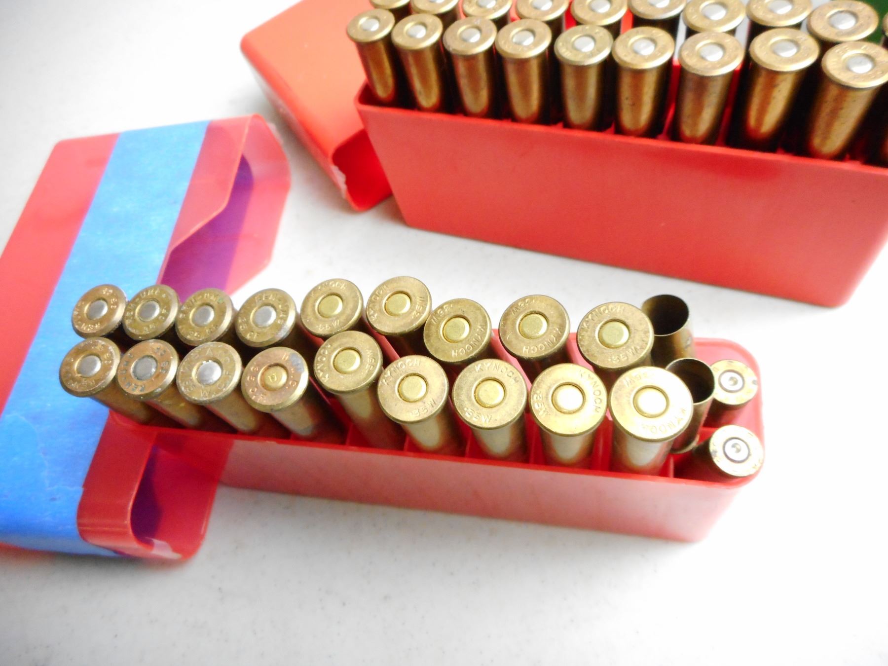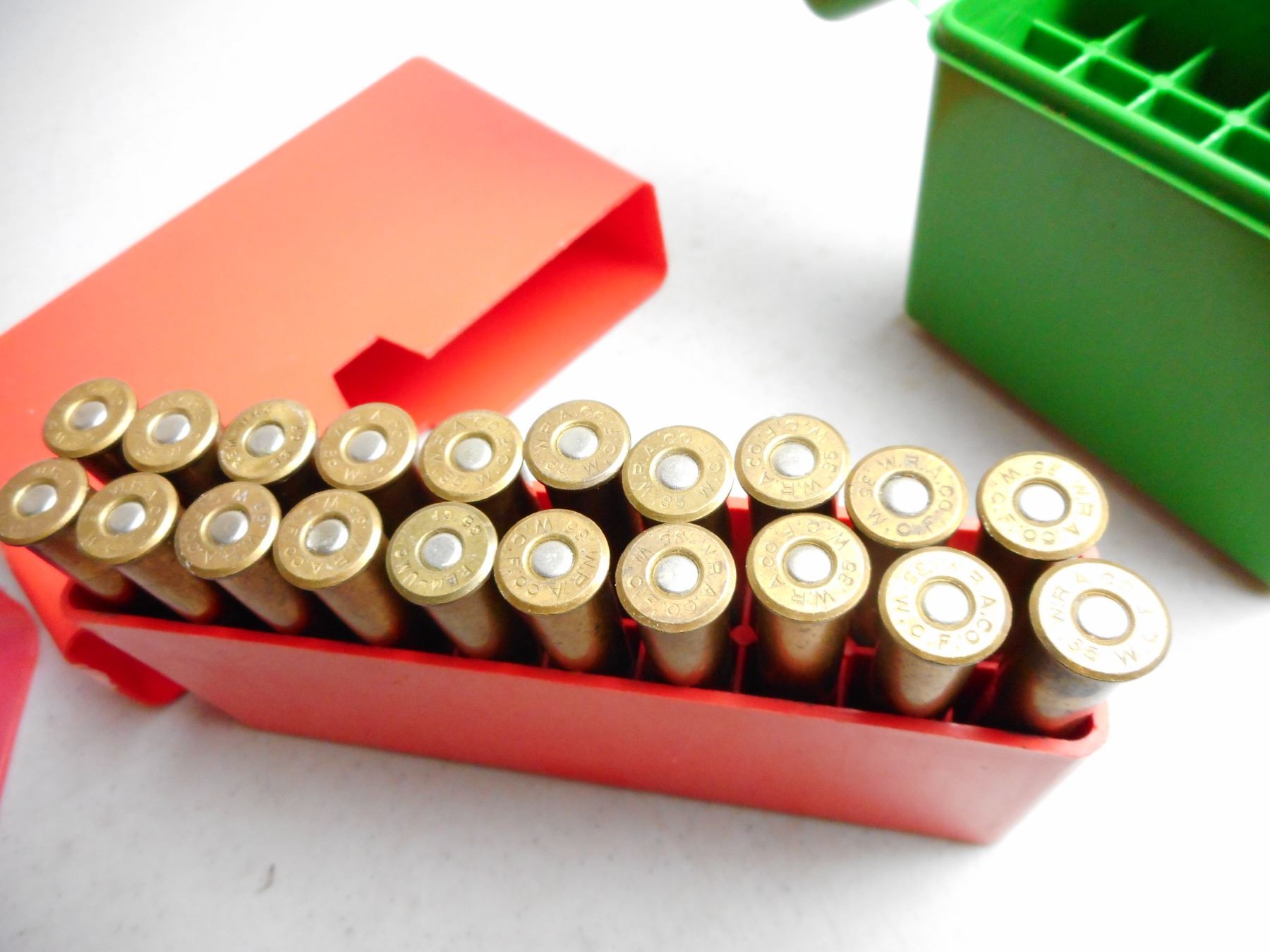 ASSORTED 35 W / 35 W.C.F. AMMO/RELOADS , 18 RNDS IN PLASTIC AMMO CASES INCLUDES EXTRA PLASTIC AMMO CASE & 6 BRASS 351 WIN SL