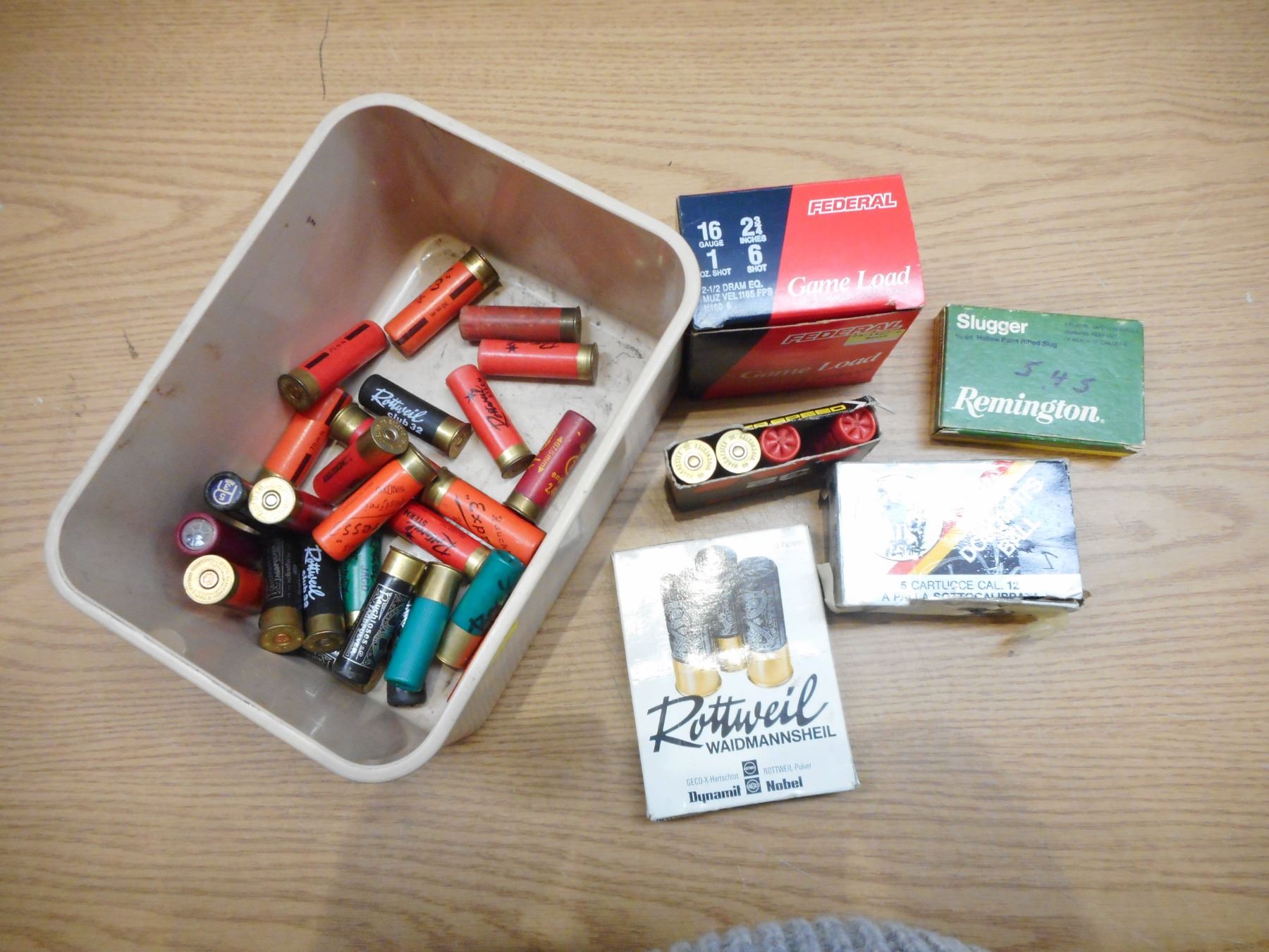 ASSORTED 12 GA & 16 GA SHOTGUN AMMO , 73 RNDS INCLUDES SHOT & SLUGS: FEDERAL 16 GA 2 3/4" #6 SHOT, ROTTWEIL 16 GA #1 SHOT, REMINGTON 16 GA SLUGS