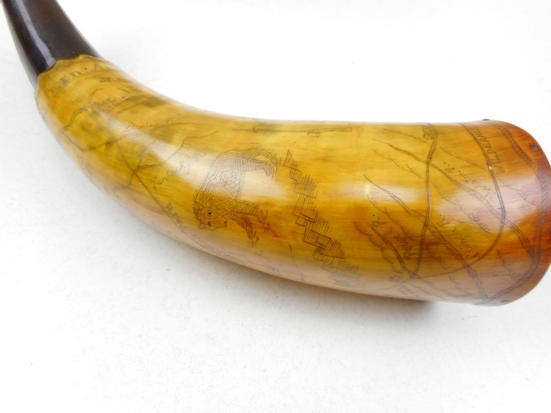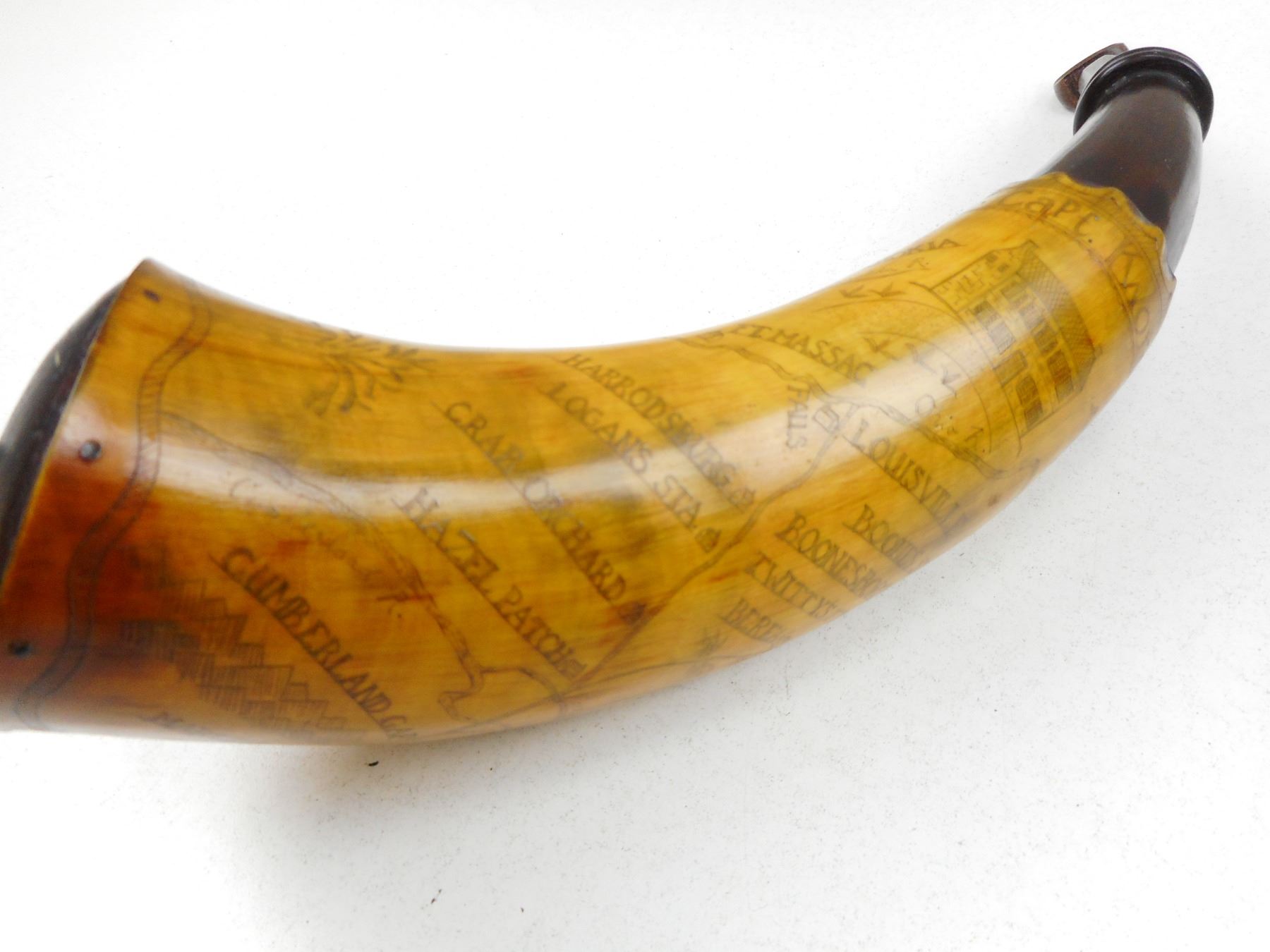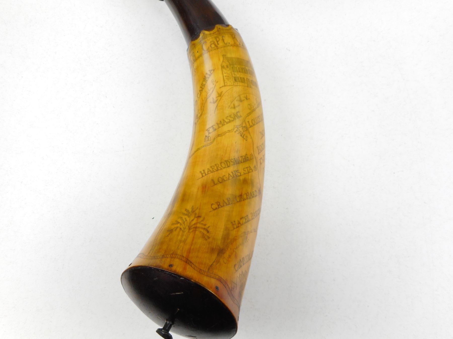 ANTIQUE 1768 REPRODUCTION POWDER HORN , WITH ENGRAVED MAP OF INDIAN TERRITORY NAMED TO CAPT. WORDEN MADE BY MASTER HORNER LEE LARKIN