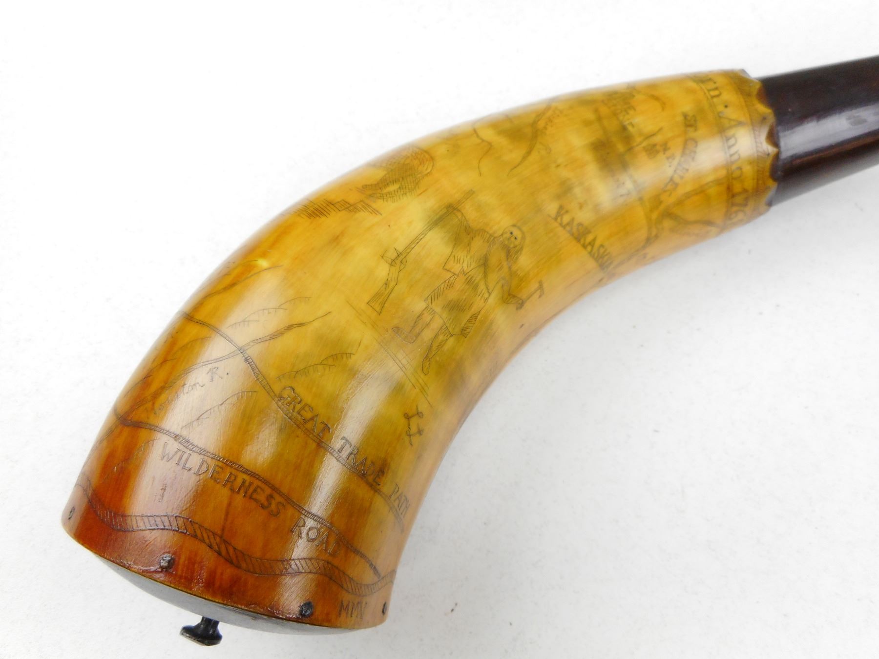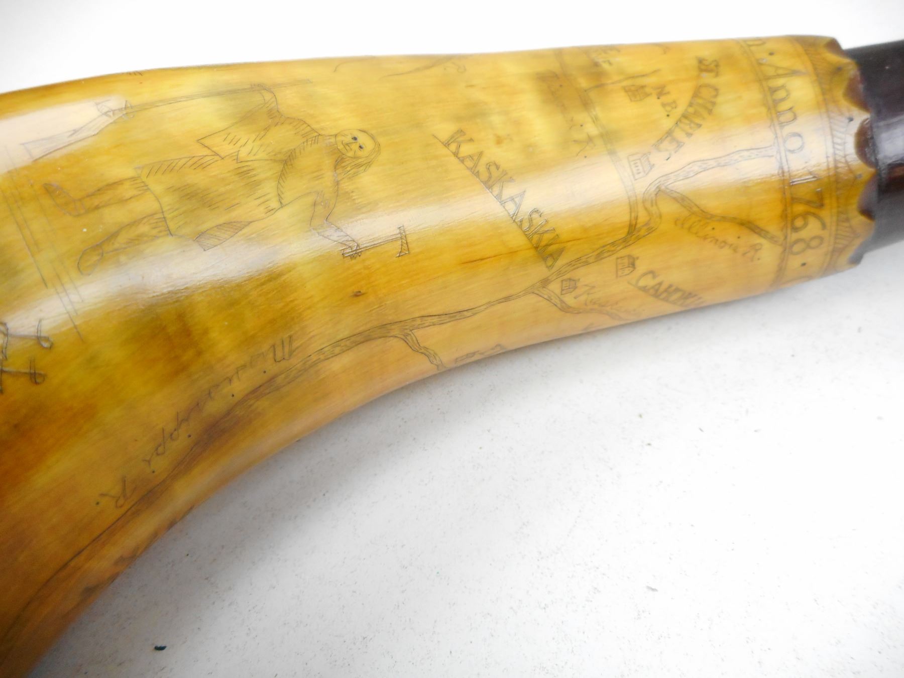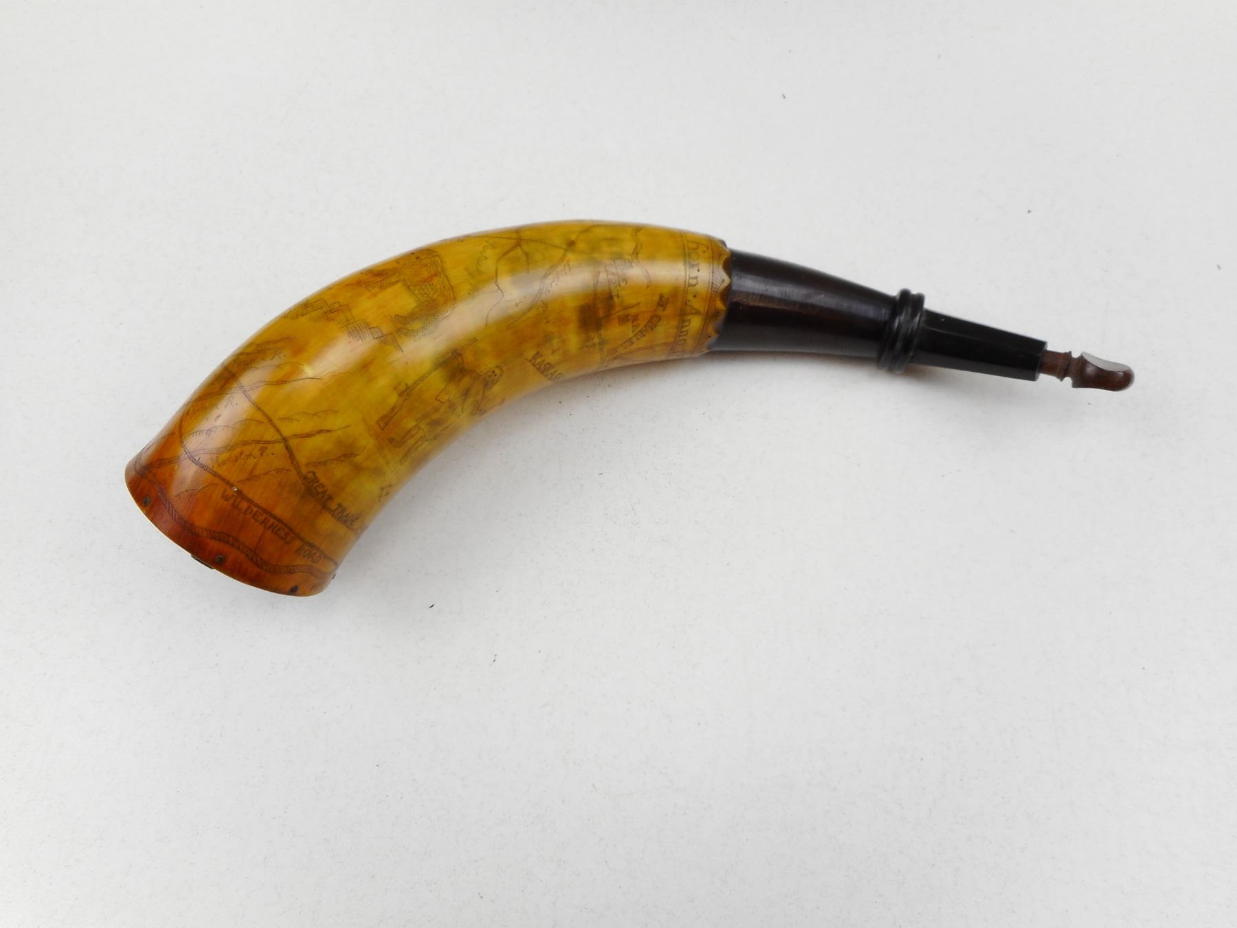ANTIQUE 1768 REPRODUCTION POWDER HORN , WITH ENGRAVED MAP OF INDIAN TERRITORY NAMED TO CAPT. WORDEN MADE BY MASTER HORNER LEE LARKIN