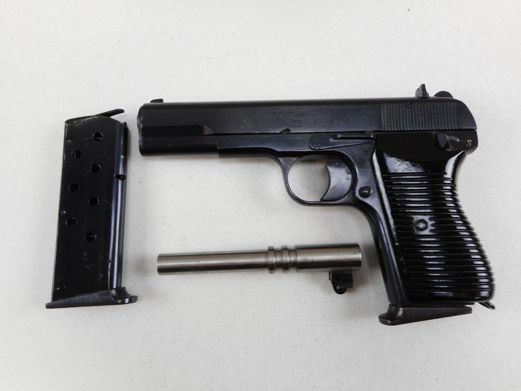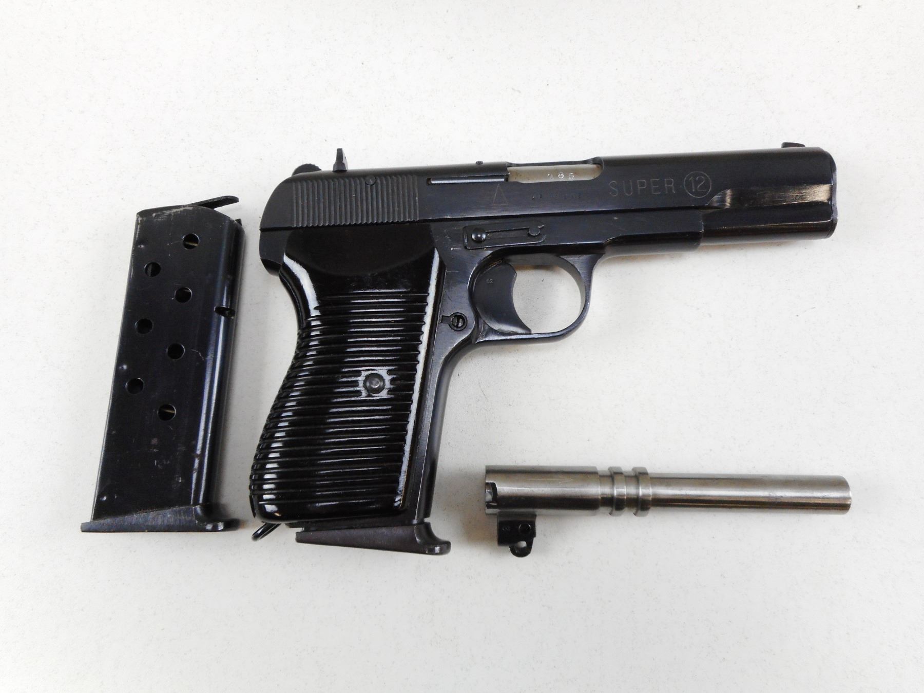 TOKAREV , MODEL: SUPER 12 , CALIBER: 9MM PARABELLUM , COMES WITH 2 MAGAZINES AND SECOND BARREL , HUNGARIAN STATE ARSENAL FACTORY 02, VERY GOOD BORE, BLADE FRONT AND FIXED REAR SIGHTS, SHOWS VERY LITTLE HANDLING MARKS, BAKALITE GRIPS , SERIAL # HF3185 , ACTION: SEMI-AUTOMATIC HANDGUN , BARREL LENGTH: 115MM , CONDITION: 8/10 , STOCK # 2749 , CLASS: CANADIAN RESTRICTED CLASS
