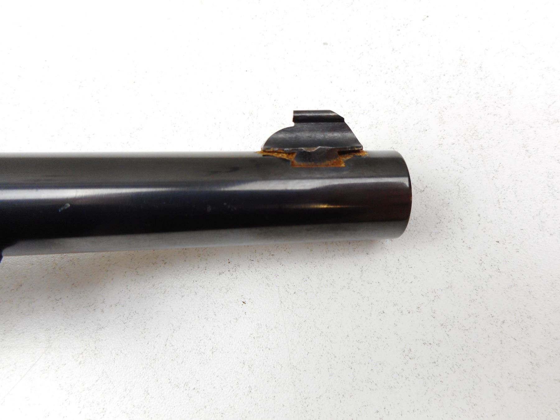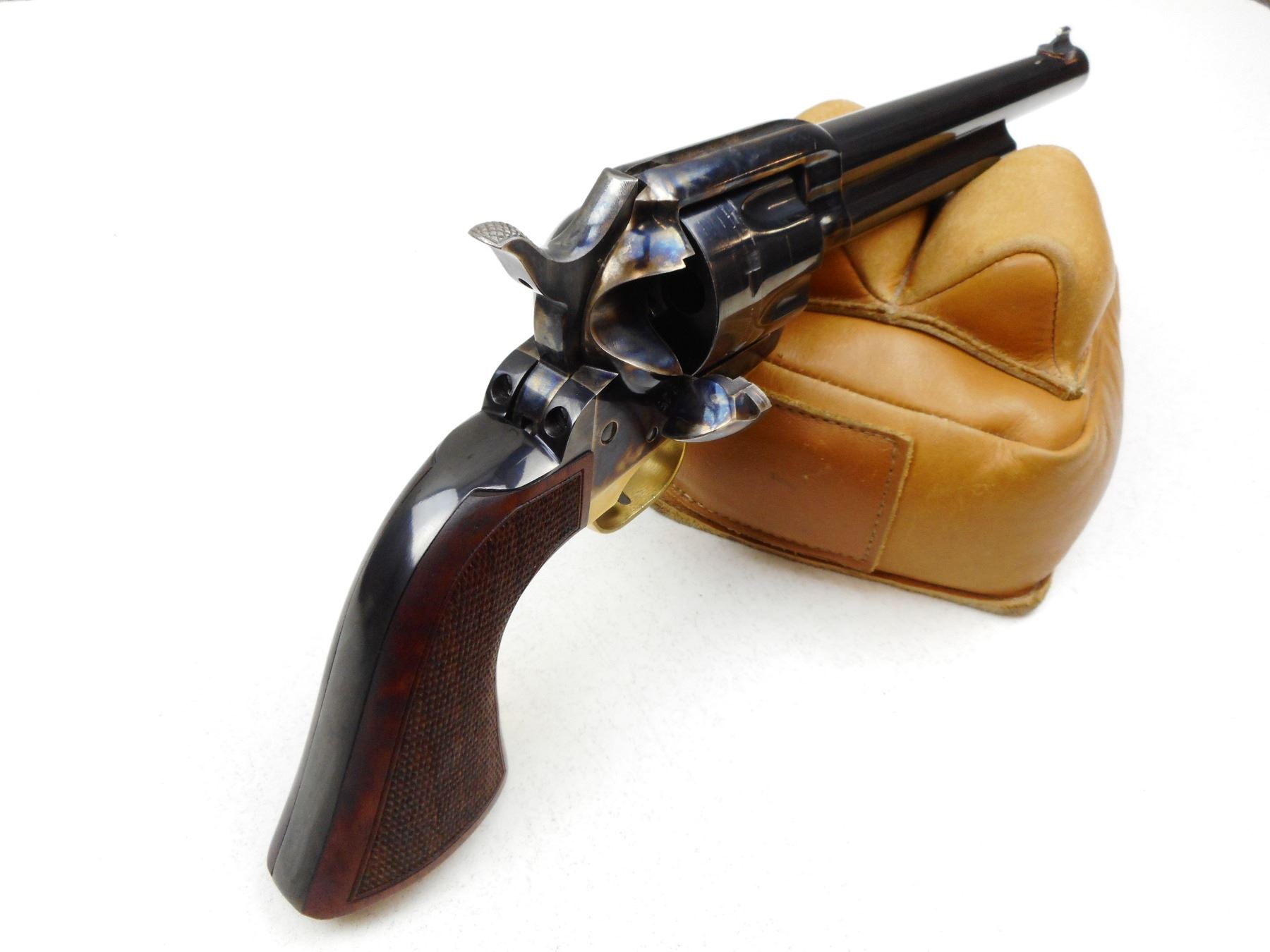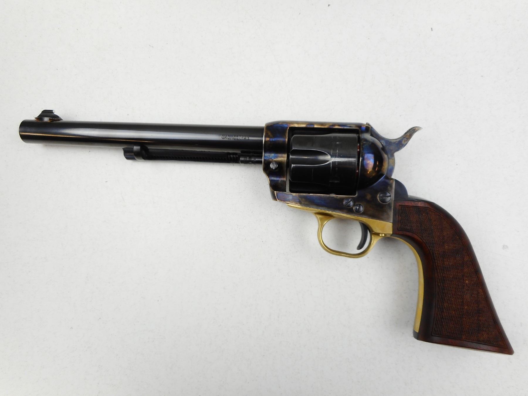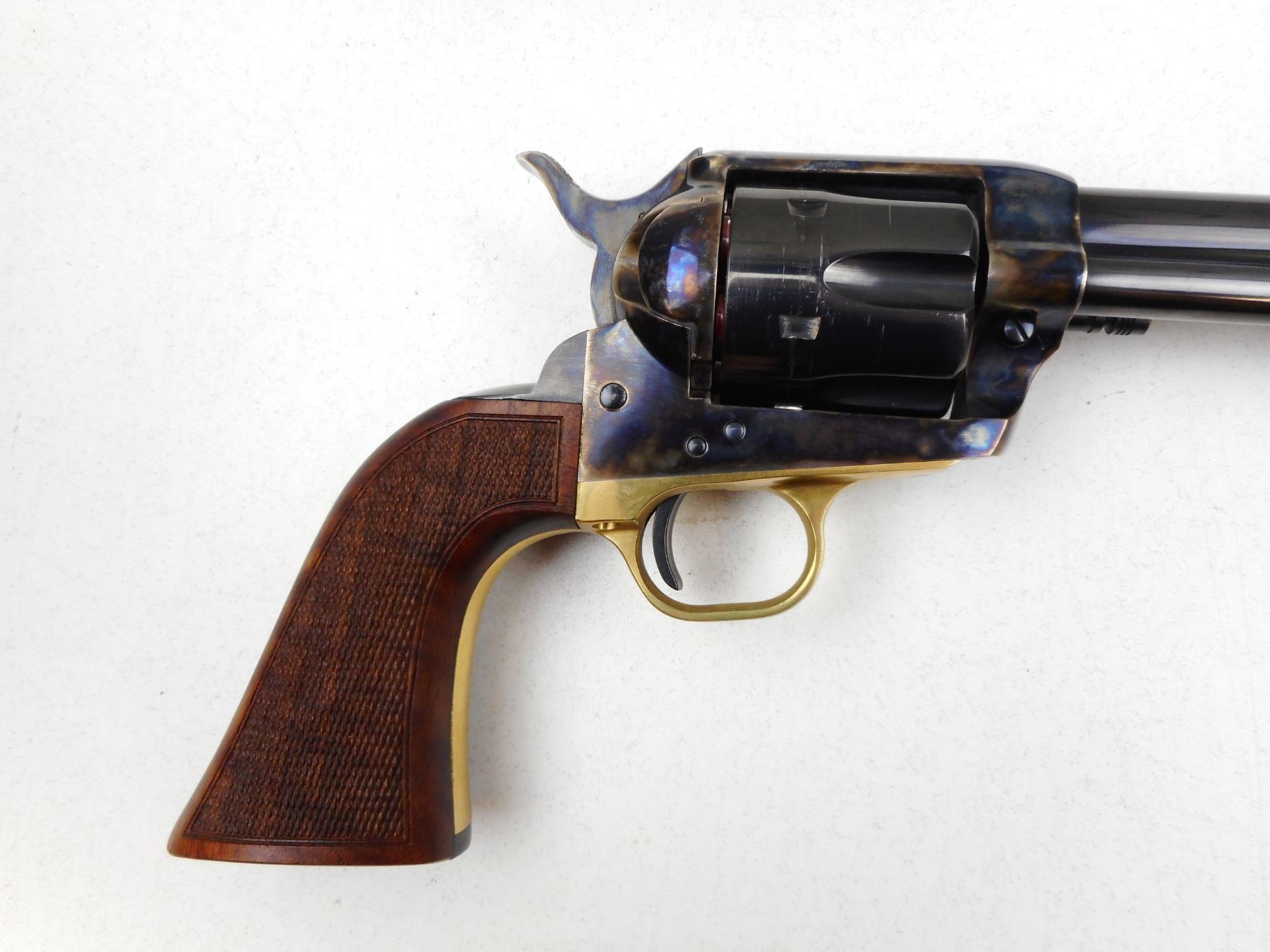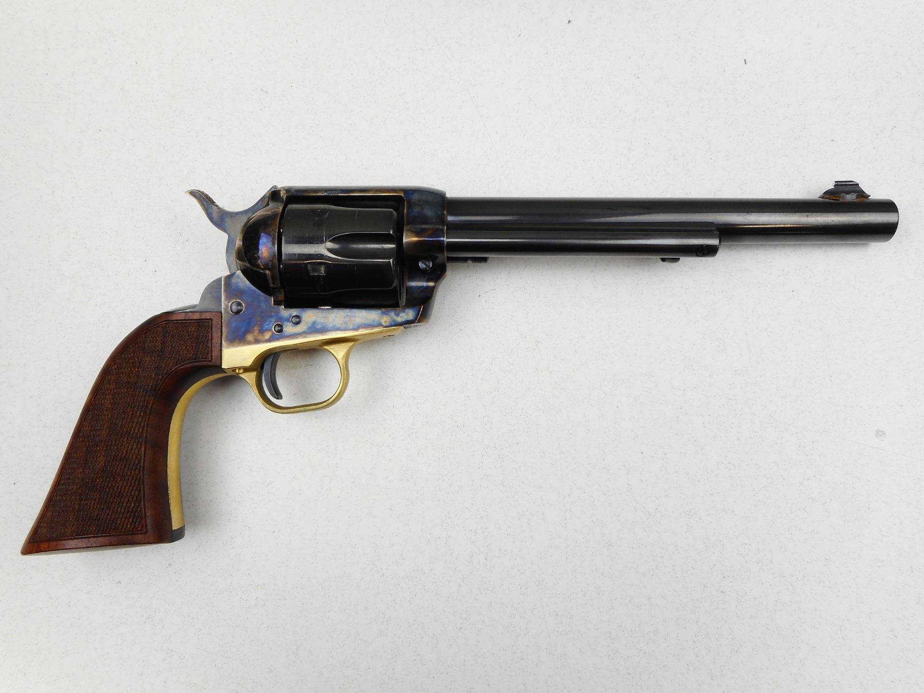 PIETTA , MODEL: COLT 1873 SINGLE ACTION ARMY REPRODUCTION , CALIBER: 357 MAG , AKA TOMBSTONE, COMES WITH SNAP CAPS, BLADE FRONT SIGHT, NOTCH REAR SIGHT, BORE IS GOOD, CASE HARDENED RECEIVER FRAME WITH BRASS TRIGGER GUARD, FINELY CHECKERED WOOD GRIP PANELS, SHOWS VERY LITTLE HANDLING MARKS , SERIAL # E32945 , ACTION: REVOLVER , BARREL LENGTH: 191MM , CONDITION: 9/10 , STOCK # 2773 , CLASS: CANADIAN RESTRICTED CLASS