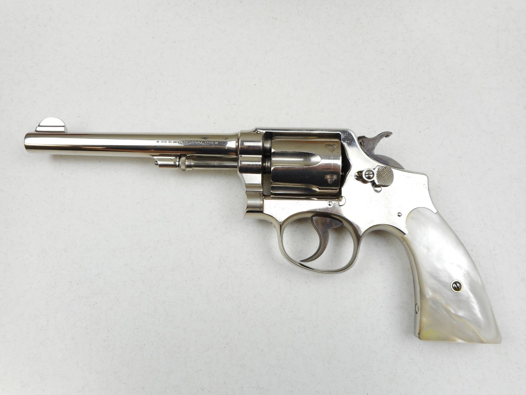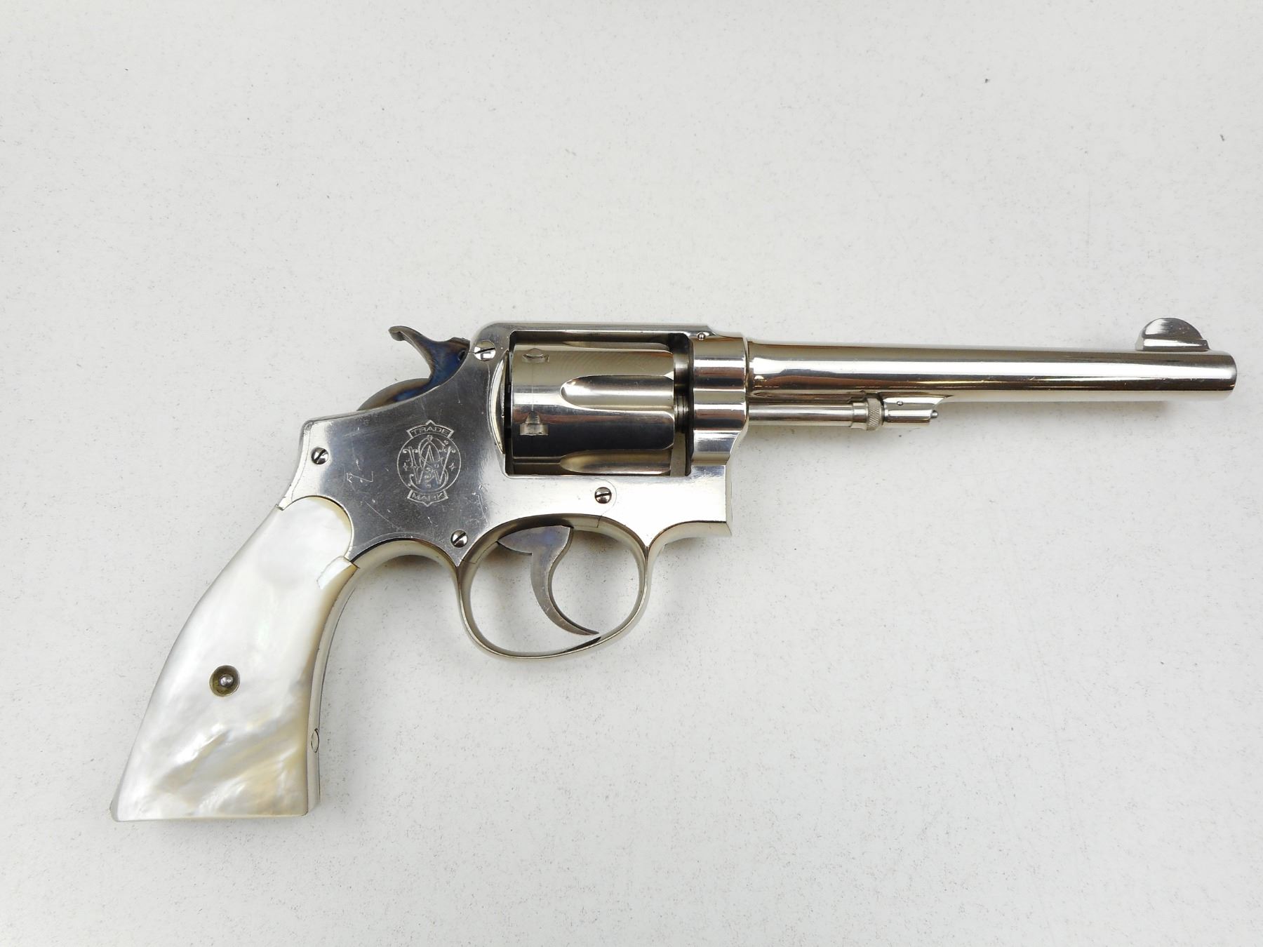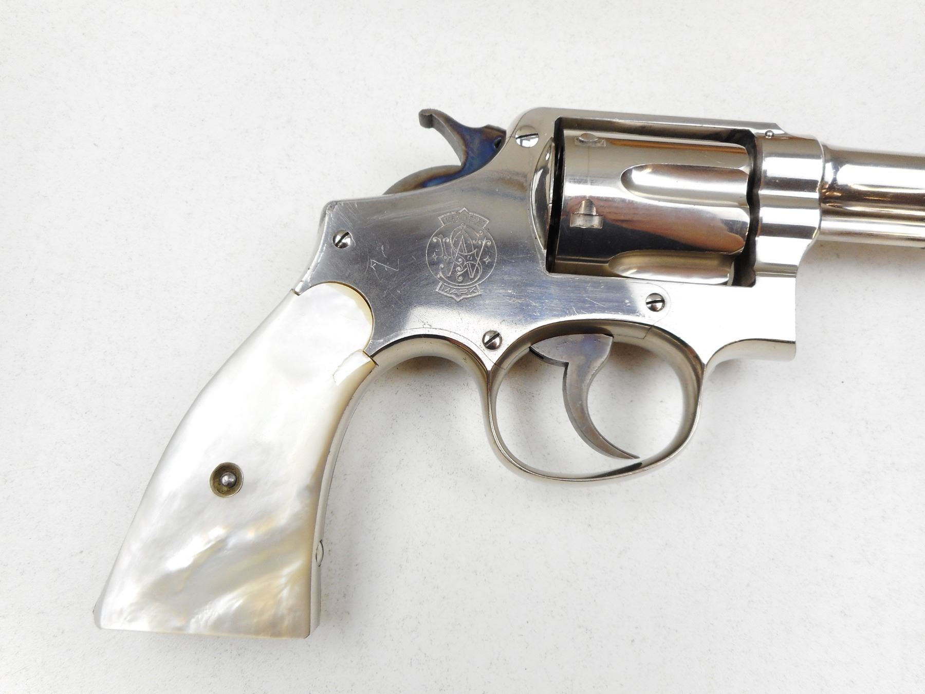 SMITH & WESSON , MODEL: HAND EJECTOR 38 MILITARY & POLICE MODEL 3 OF 1905 CHANGE 3 , CALIBER: 38 SPECIAL , BORE IS VERY GOOD, BLADE FRONT AND NOTCH REAR SIGHT, NICKEL PLATED FINISH, WITH MOTHER OF PEARL GRIPS, MINOR CHIPS IN RIGHT GRIP PANEL, SHOWS SOME HANDLING MARKS , SERIAL # 226945 , ACTION: REVOLVER , BARREL LENGTH: 152MM , CONDITION: 7/10 , STOCK # 2868 , CLASS: CANADIAN RESTRICTED CLASS