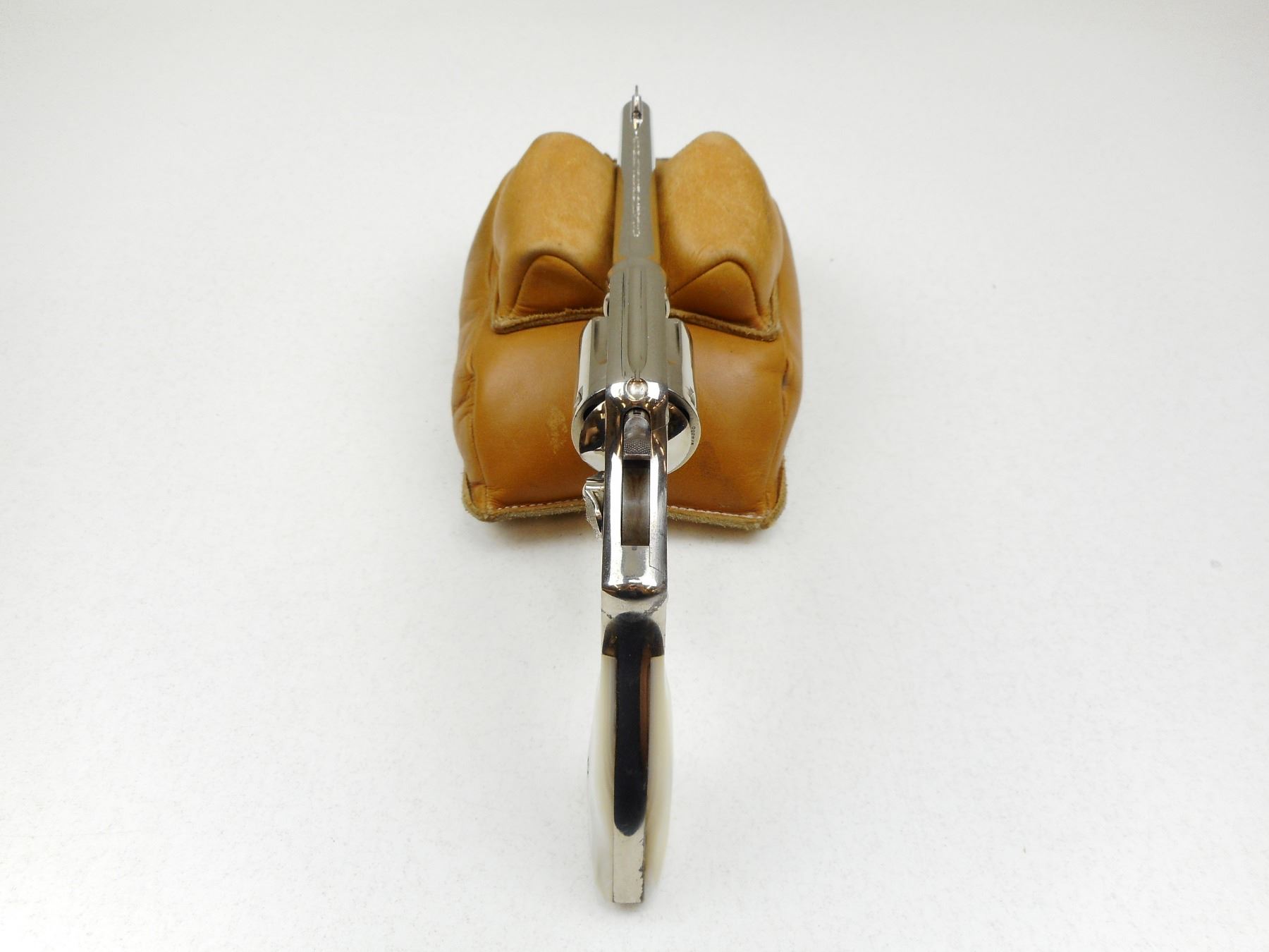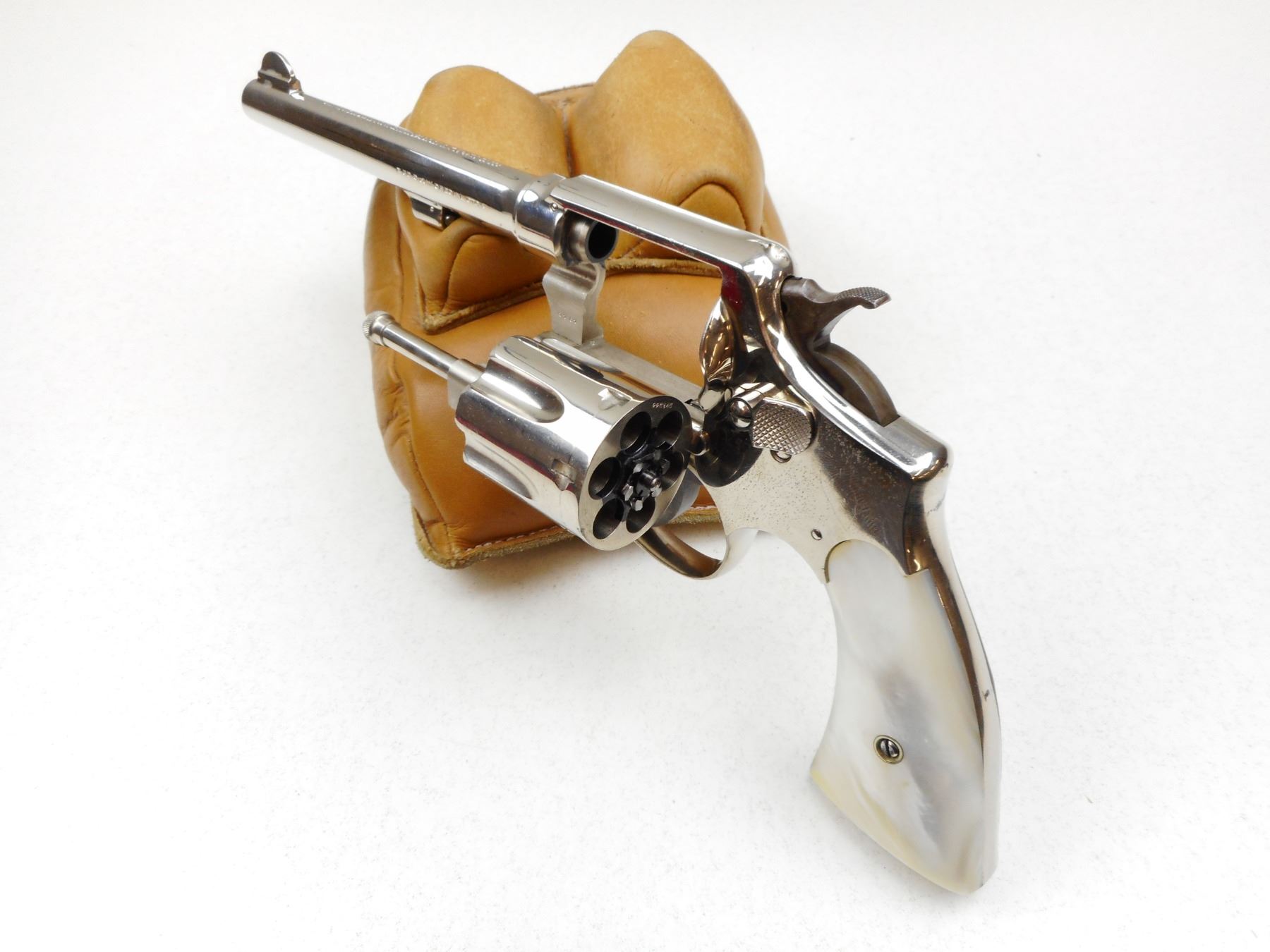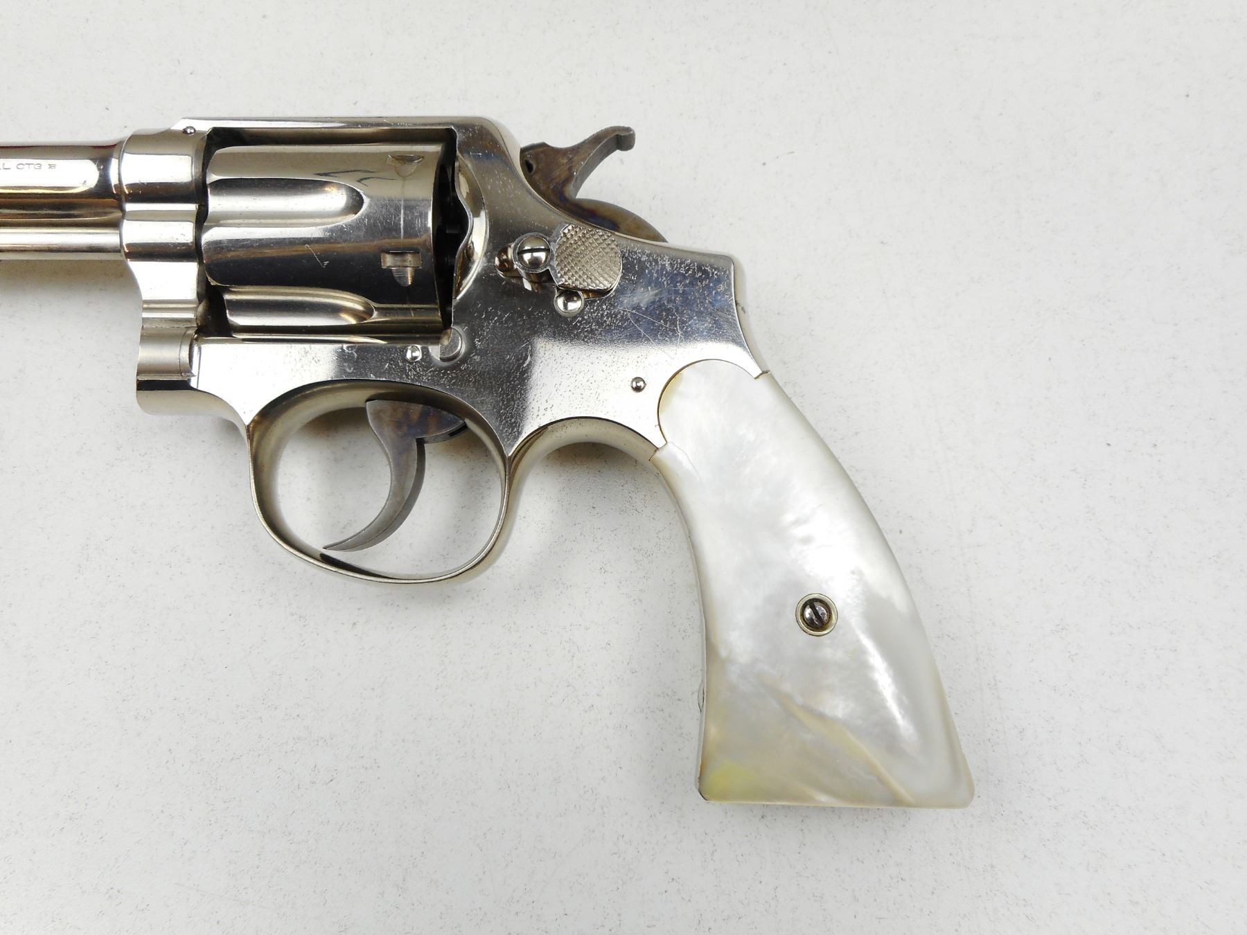 SMITH & WESSON , MODEL: HAND EJECTOR 38 MILITARY & POLICE MODEL 3 OF 1905 CHANGE 3 , CALIBER: 38 SPECIAL , BORE IS VERY GOOD, BLADE FRONT AND NOTCH REAR SIGHT, NICKEL PLATED FINISH, WITH MOTHER OF PEARL GRIPS, MINOR CHIPS IN RIGHT GRIP PANEL, SHOWS SOME HANDLING MARKS , SERIAL # 226945 , ACTION: REVOLVER , BARREL LENGTH: 152MM , CONDITION: 7/10 , STOCK # 2868 , CLASS: CANADIAN RESTRICTED CLASS