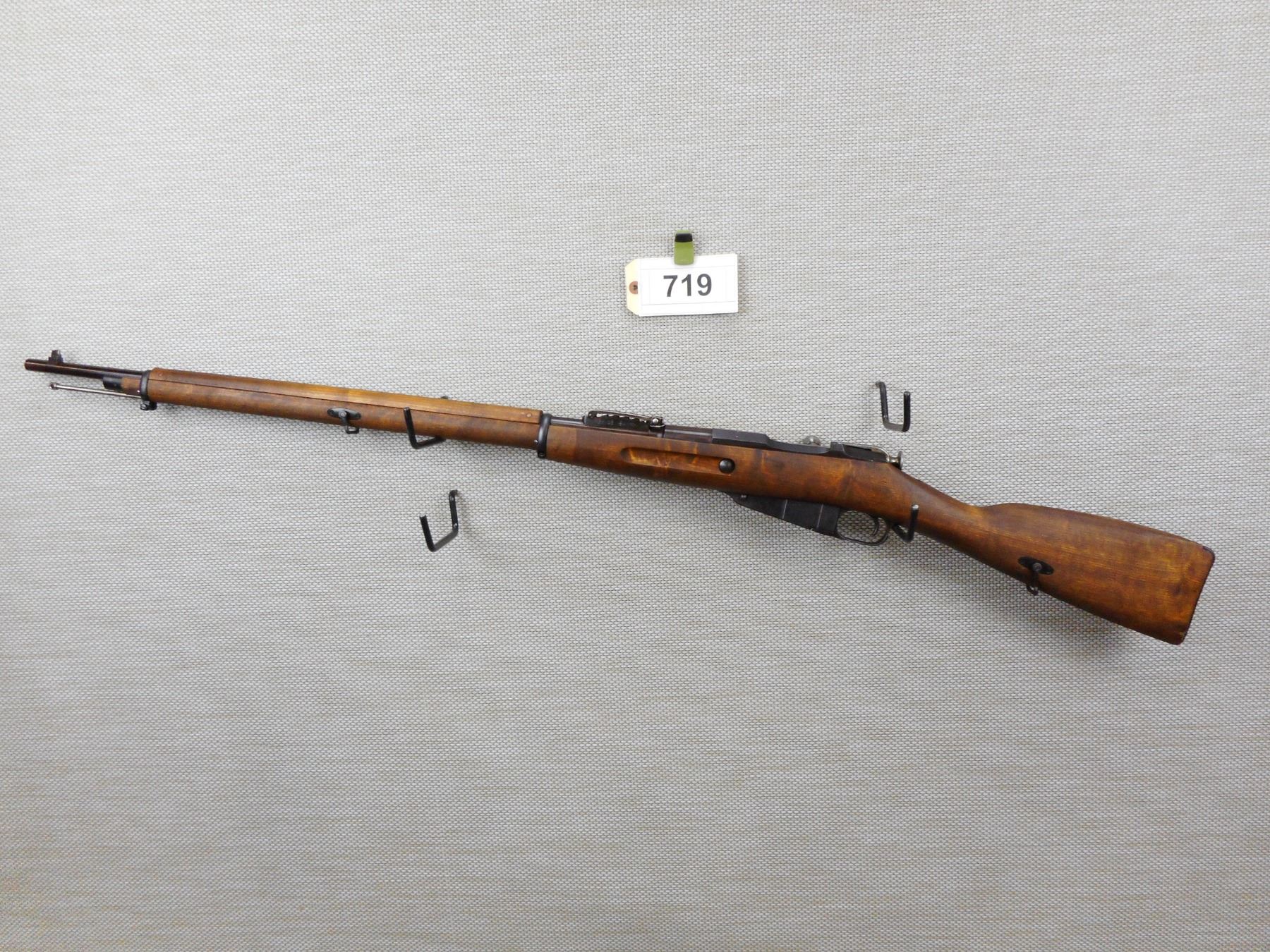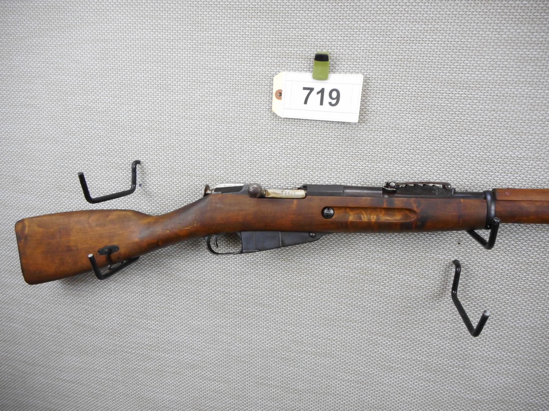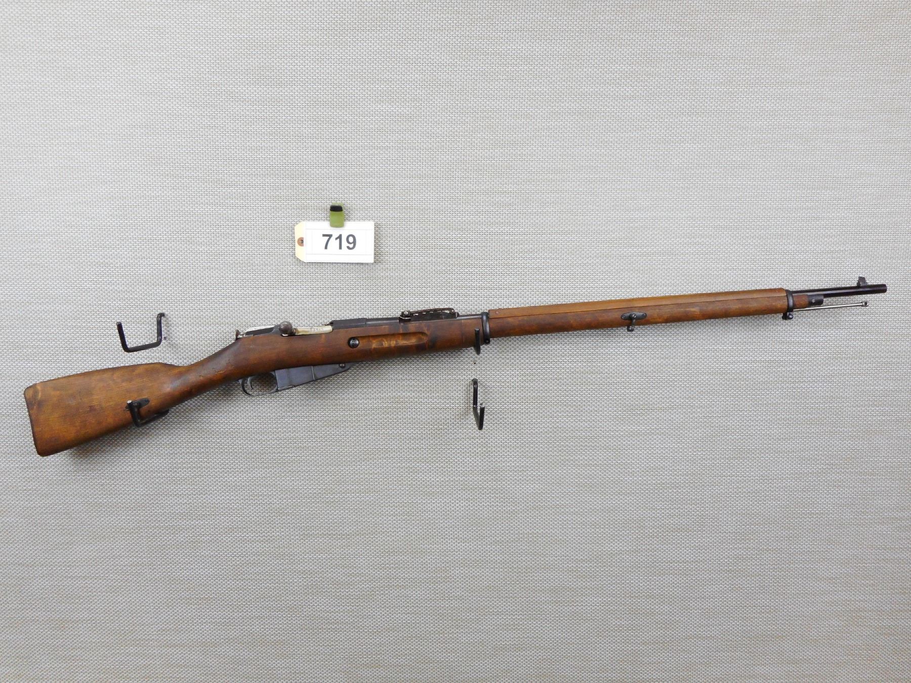 WWII ERA, MOSIN NAGANT , MODEL: 1931 FINNISH , CALIBER: 7.62 X 54R , BOLT AND RECEIVER MATCH BY SERIAL #, MANUFACTURED BY VKT, DATED 1942 WWII ERA, EXCELLENT BORE,RETAINS FULL MILITARY CONFIGURATION, HAS SOME HANDLING MARKS, SLING SWIVEL LOOPS, STEEL BUTT PLATE, BLADE FRONT AND ADJUSTABLE REAR SIGHTS , SERIAL # 27145 , ACTION: BOLT ACTION RIFLE , BARREL LENGTH: 32" , CONDITION: 7/10 , STOCK # 8724 , CLASS: CANADIAN NON RESTRICTED CLASS