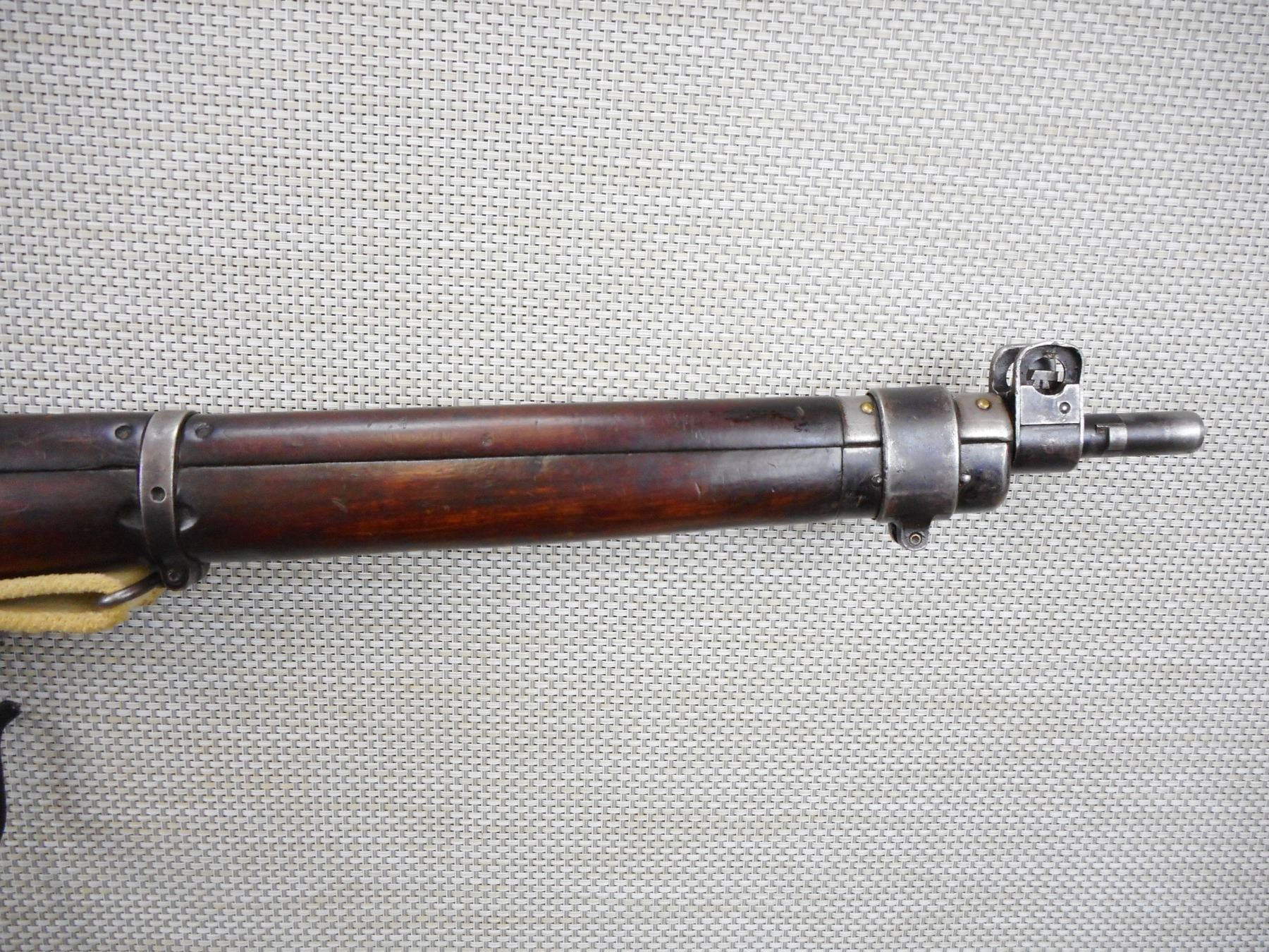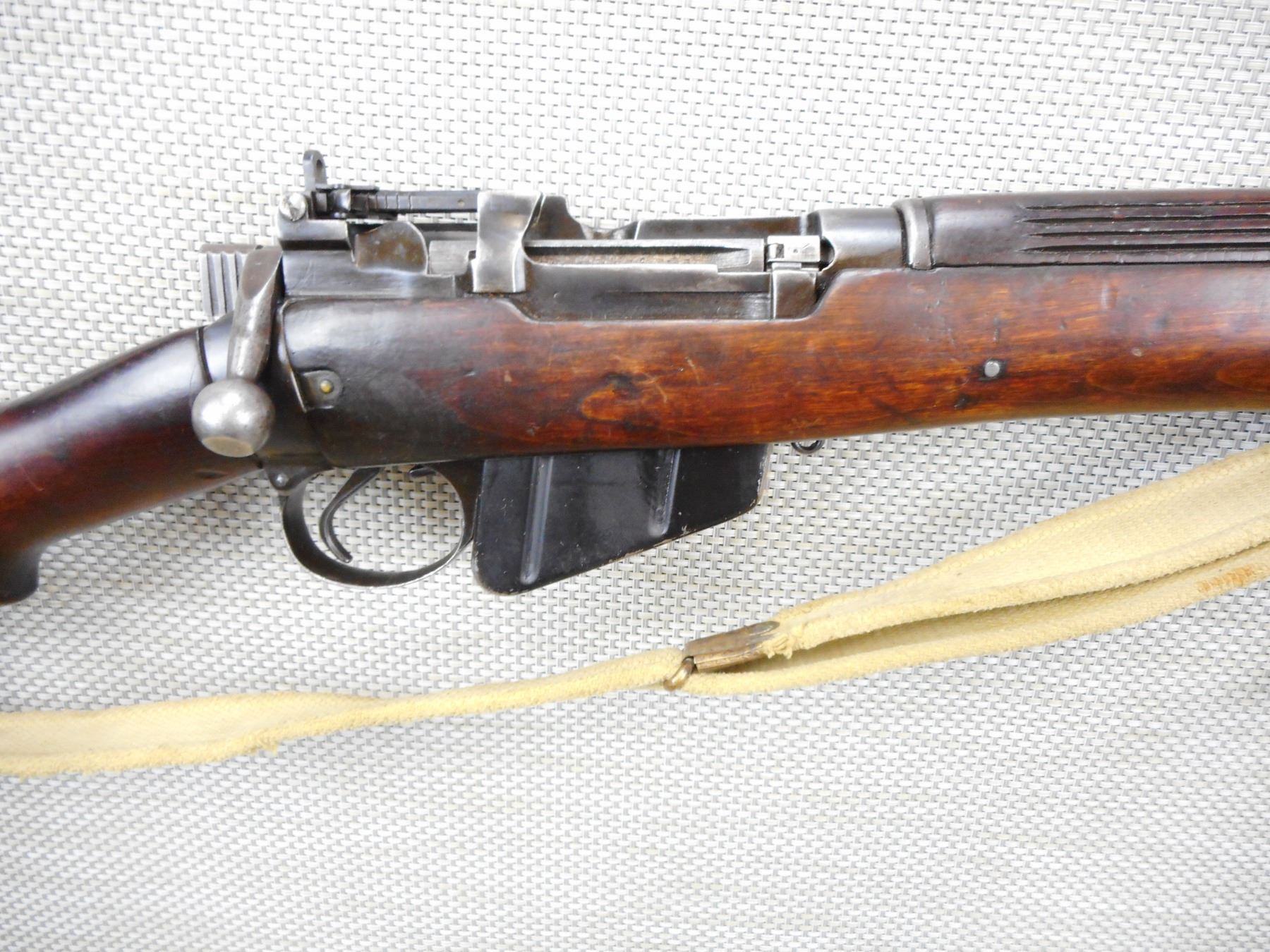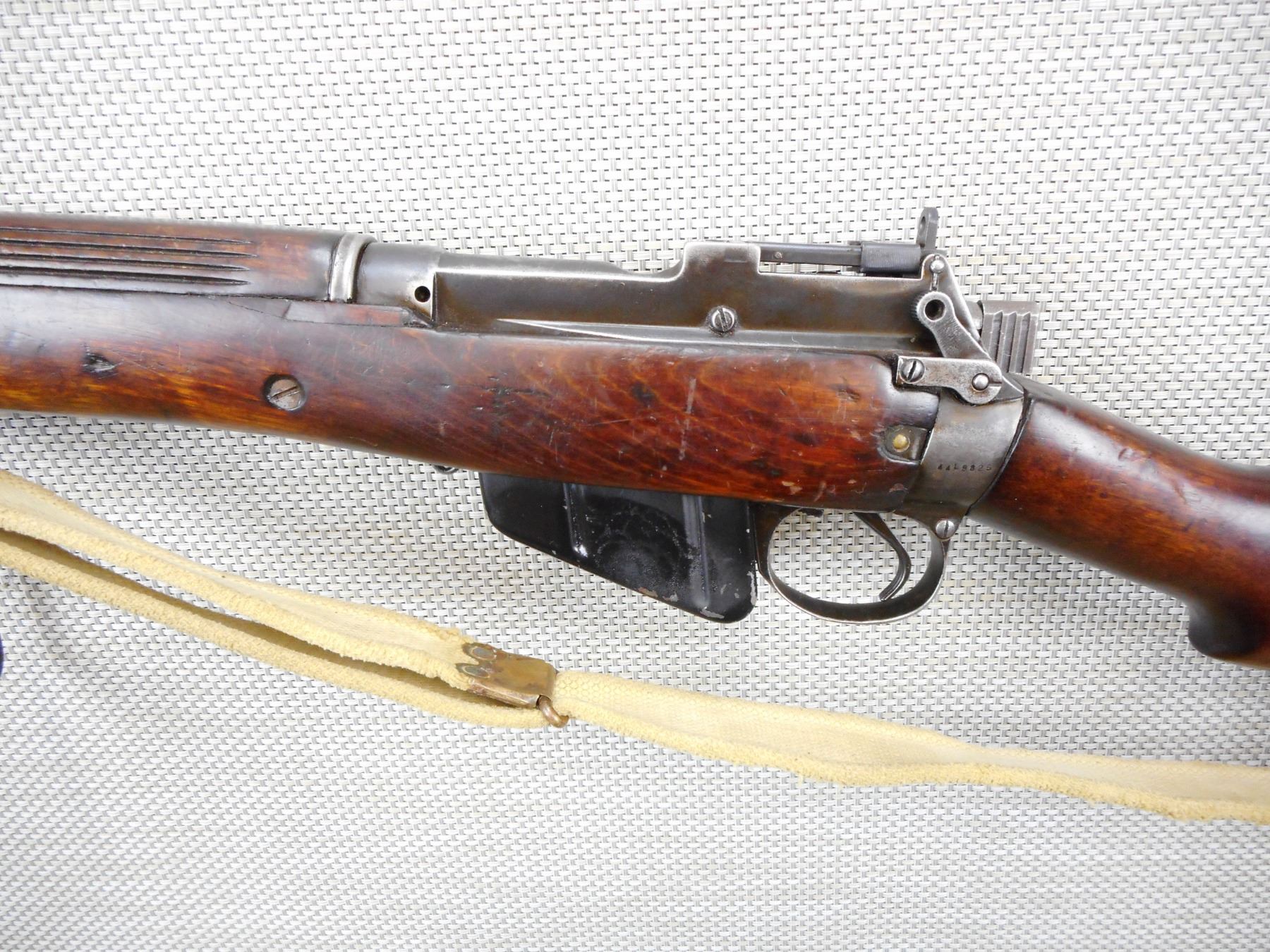 LEE ENFIELD , MODEL: NO 4 MKI SMLE , CALIBER: 303 BR , COMES WITH MAGAZINE, MARKINGS HAVE BEEN REMOVED, BORE IS VERY GOOD, RETAINS FULL MILITARY CONFIGURATION, ORIGINAL MILITARY CANVAS SLING, BARLEY CORN FRONT AND PEEP REAR SIGHT, SHOWS SOME HANDLING MARKS, SMALL CRACK IN THE FOREND, STEEL BUTT PLATE, BELIEVED TO BE MADE AT LONG BRANCH IN TORONTO BECUASE OF THE STEEL BUTT PLATE AND THE L ON THE SERIAL # , SERIAL # 44L9825 , ACTION: BOLT ACTION RIFLE , BARREL LENGTH: 25" , CONDITION: 6/10 , STOCK # 8760 , CLASS: CANADIAN NON RESTRICTED CLASS