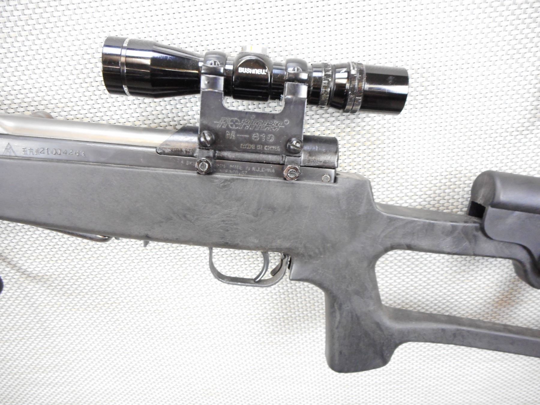 NORINCO , MODEL: SKS SPORTER , CALIBER: 7.62 X 39 , SERIAL # REMOVED ON THE BOLT, BORE IS EXCELLENT, CUSTOM SPORTERIZED SYNTHETIC STOCK WITH FOLDING BIPOD, AS WELL AS AN ADJUSTABLE CHEEK PIECE, MISSING THE FRONT SIGHT, ADJUSTABLE REAR SIGHT, BUSHNELL 22 VARMIT SCOPE THE SCOPE IS MISSING THE PLASTIC ADJUSTMENT COVERS, SHOWS SOME HANDLING MARKS, MISSING THE REAR SLING SWIVEL HOWEVER THE STOCK HAS OPTIONS FOR THE SLING TO BE HELD , SERIAL # 21004263 , ACTION: SEMI AUTOMATIC RIFLE , BARREL LENGTH: 20 1/2" , CONDITION: 7/10 , STOCK # 9035 , CLASS: CANADIAN NON RESTRICTED CLASS