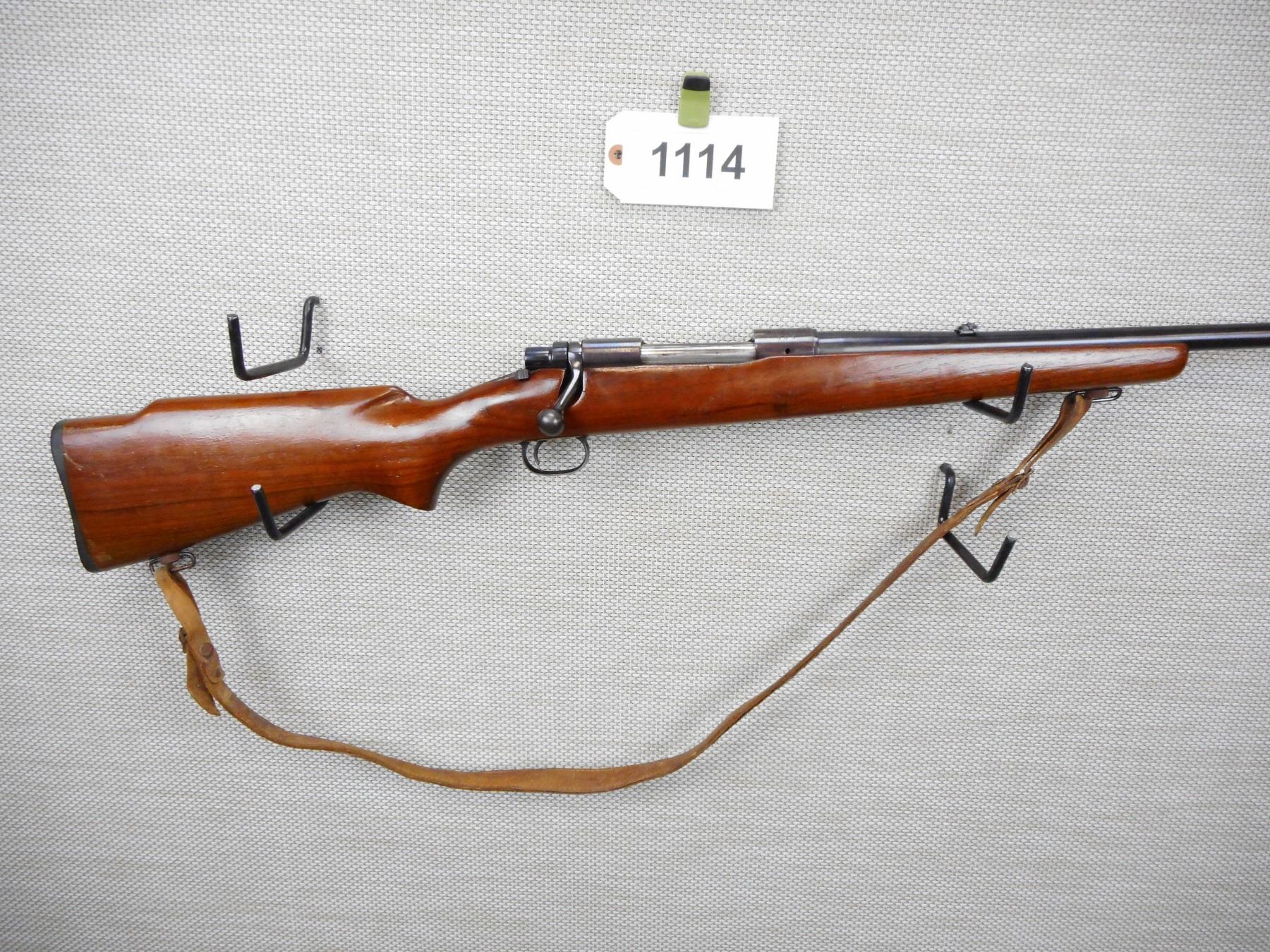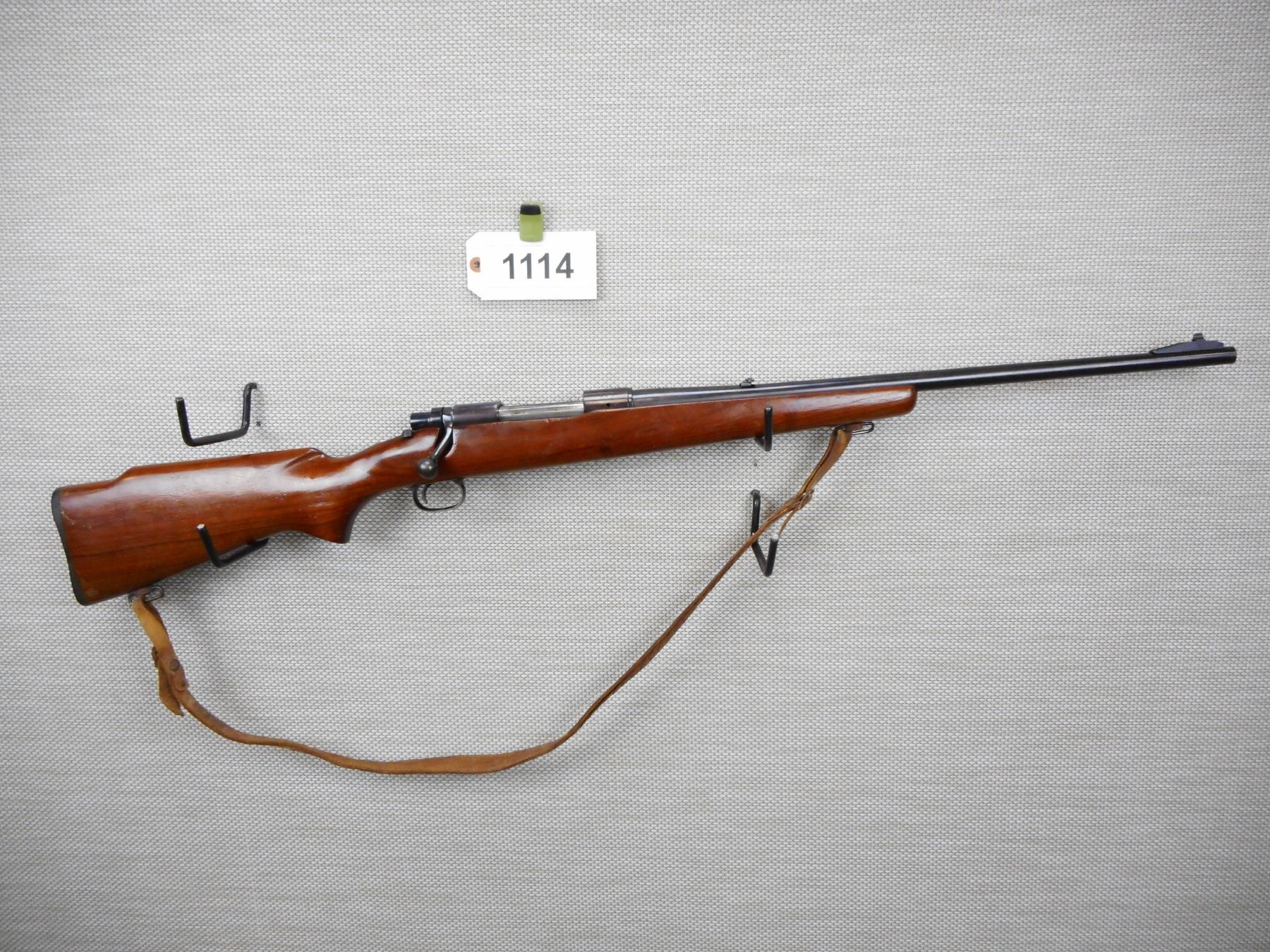 COOEY , MODEL: 71 , CALIBER: 308 WIN , BORE IS VERY GOOD, RAMP FRONT AND ADJUSTABLE REAR SIGHT, DRILLED AND TAPPED FOR SCOPE MOUNTS, ONE PIECE HARDWOOD STOCK WITH RAISED CHEEK PIECE, SLING SWIVELS WITH LEATHER SLING, PLASTIC BUTT PLATE, SHOWS SOME HANDLING MARKS , SERIAL # 589 , ACTION: BOLT ACTION RIFLE , BARREL LENGTH: 22" , CONDITION: 6/10 , STOCK # 9119 , CLASS: CANADIAN NON RESTRICTED CLASS