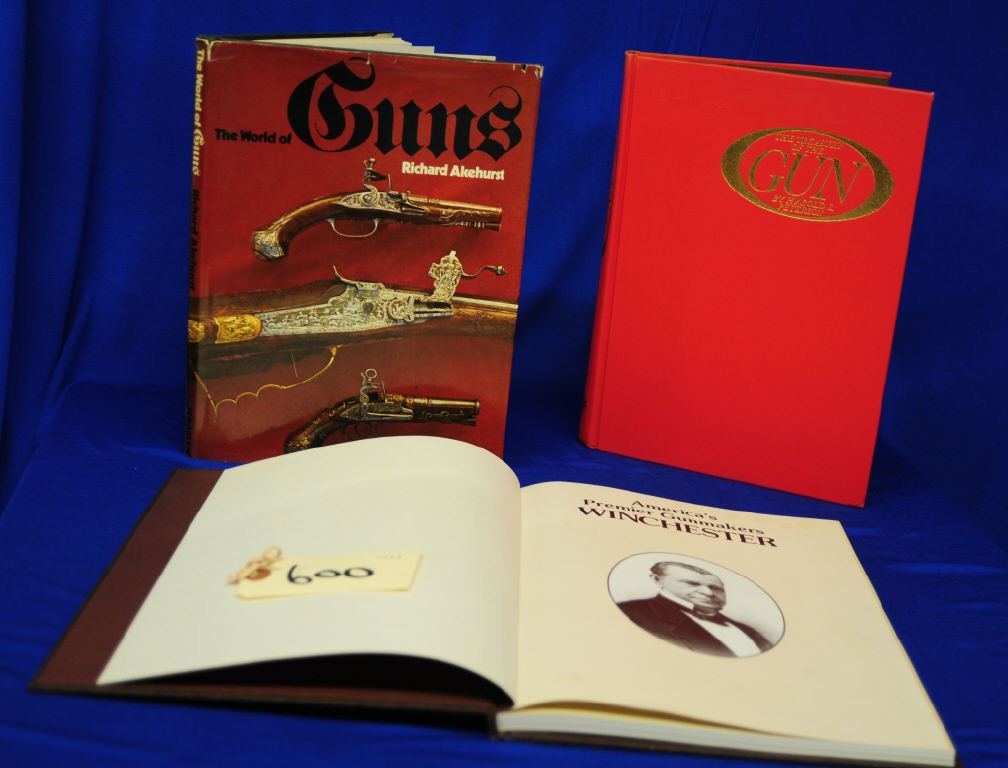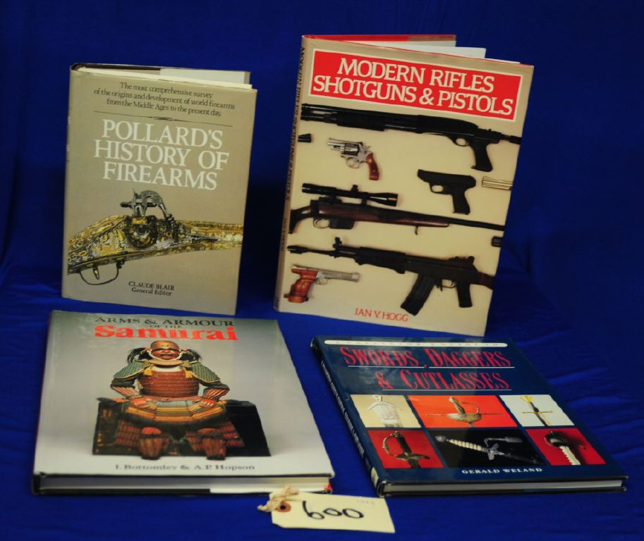 1) Pollards HIstory of Firearms, Claude BleAir, 1985 2)The Treasury of the Gun, Harold Peterson 1962 3)Americas Premier Gun Makers Winchester,K.D. Kirikland 1989 4)The World of Guns, Richard Akehurst, 1973 5) Swords, Daggers and Cutlasses, Gerald Weland 1991 6) Arms and Armour of the Samurai, Bottmely& Hopson 1991 7) Modern RIfles Shotguns and Pistols, Ivan Hogg 1988