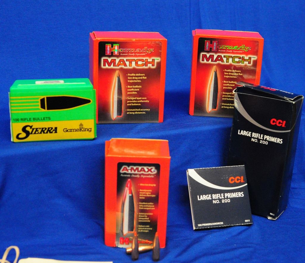1) 2 Boxes of Hornady 30 Cal. 255 gr, 1 box full 100pcs , 2nd box with 43 pcs 2) 1 part box of Sierra Game King 30 cal 180 gr, 54 pcs 3) 1part box of A max Hornady 30 cal, 17 pcs 4) 1 part box of CCI No. 200 Large Rifle Primers , 600 primers in 6 packs